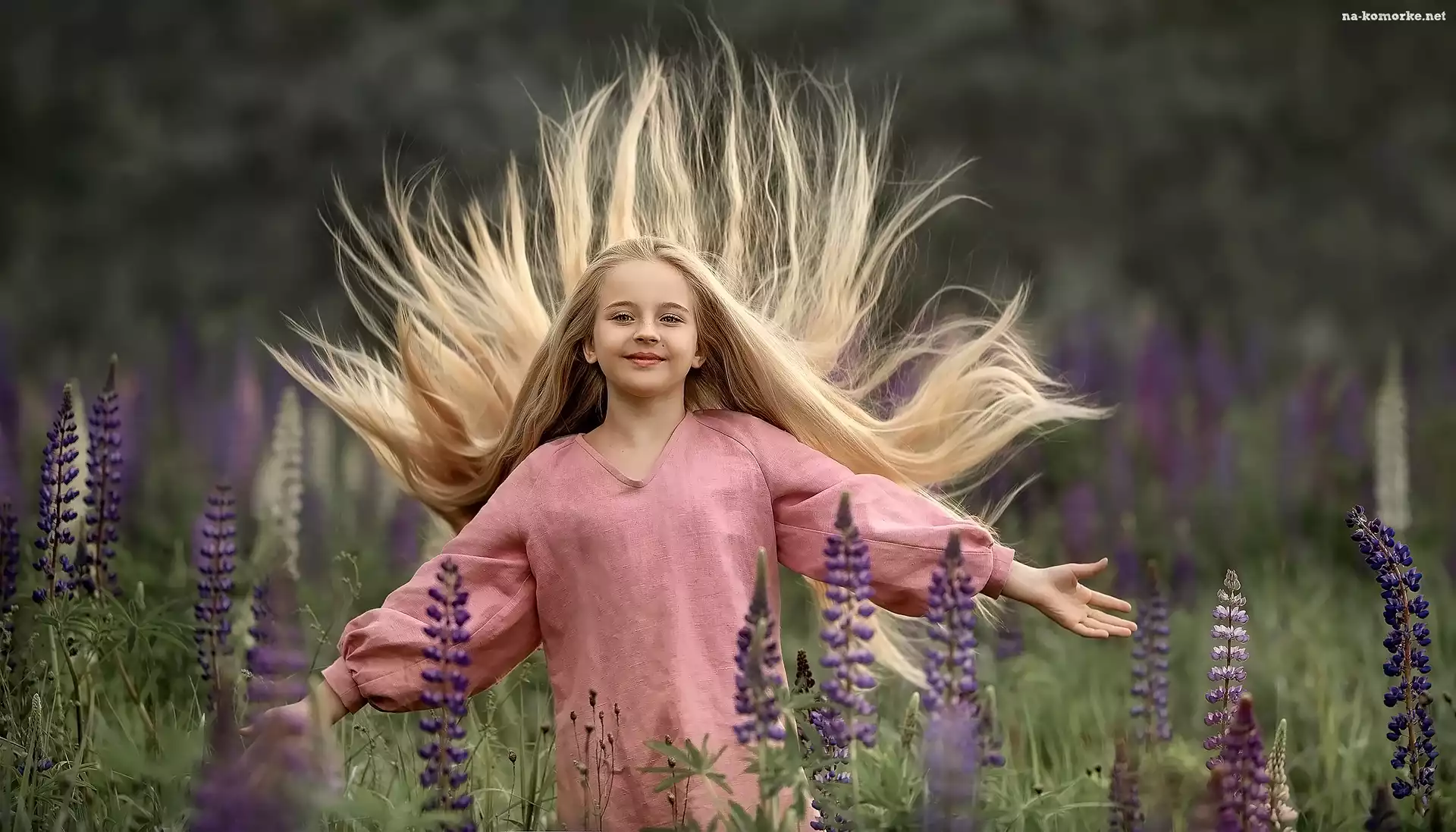 Włosy, Dziewczynka, Dziecko, Łubin, Rozwiane, Kwiaty na Komórkę