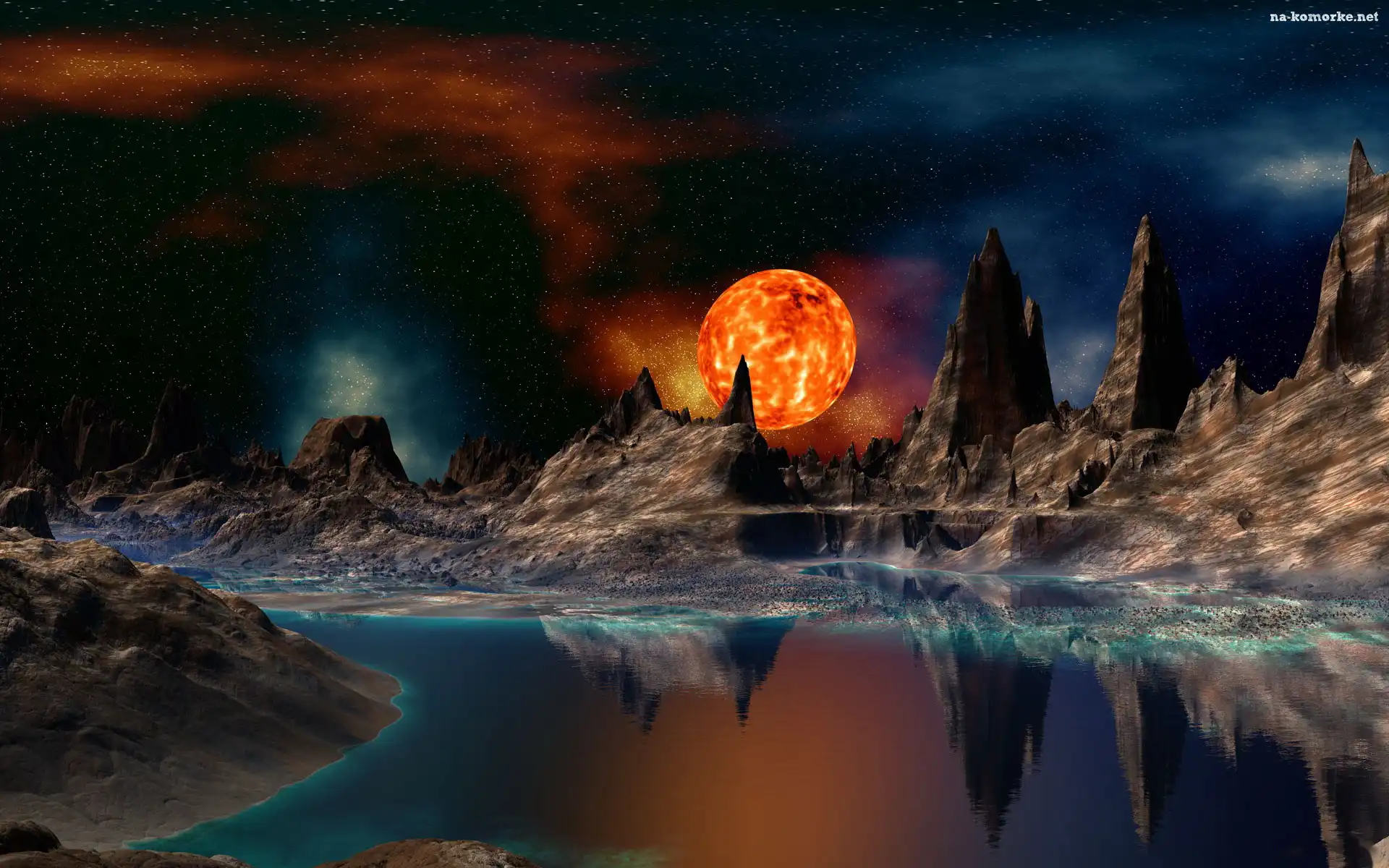 Woda, Fantasy, Słońce, Gwiazdy, Góry na Komórkę
