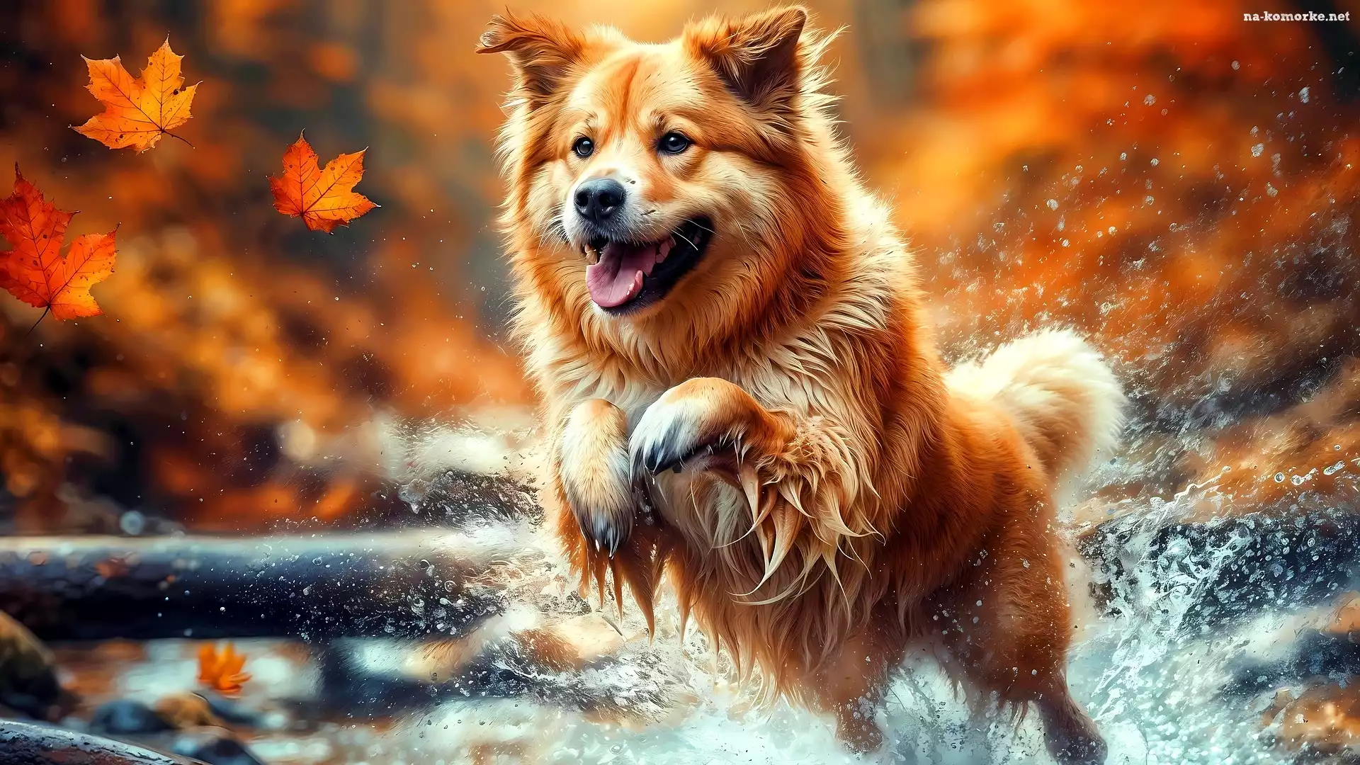 Grafika, Woda, Jesienne, Pies, Liście na Komórkę