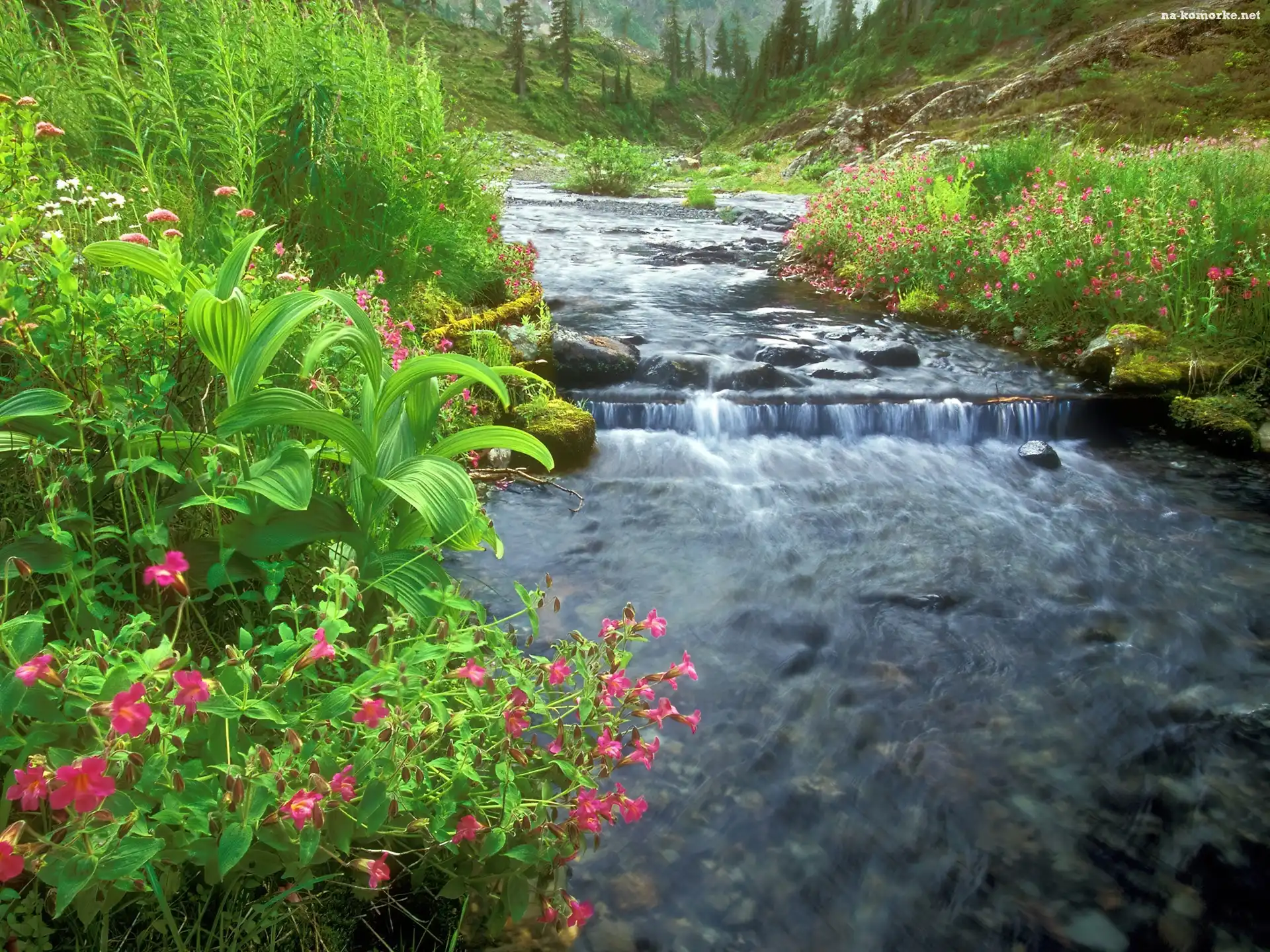 Woda, Zieleń, Kamienie, Kwiatki na Komórkę