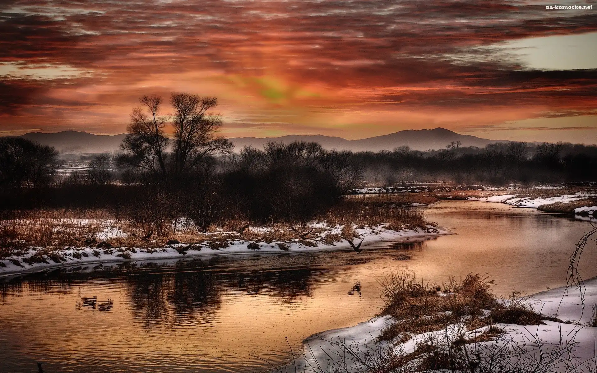 Woda, Niebo, Śnieg, Drzewa na Komórkę