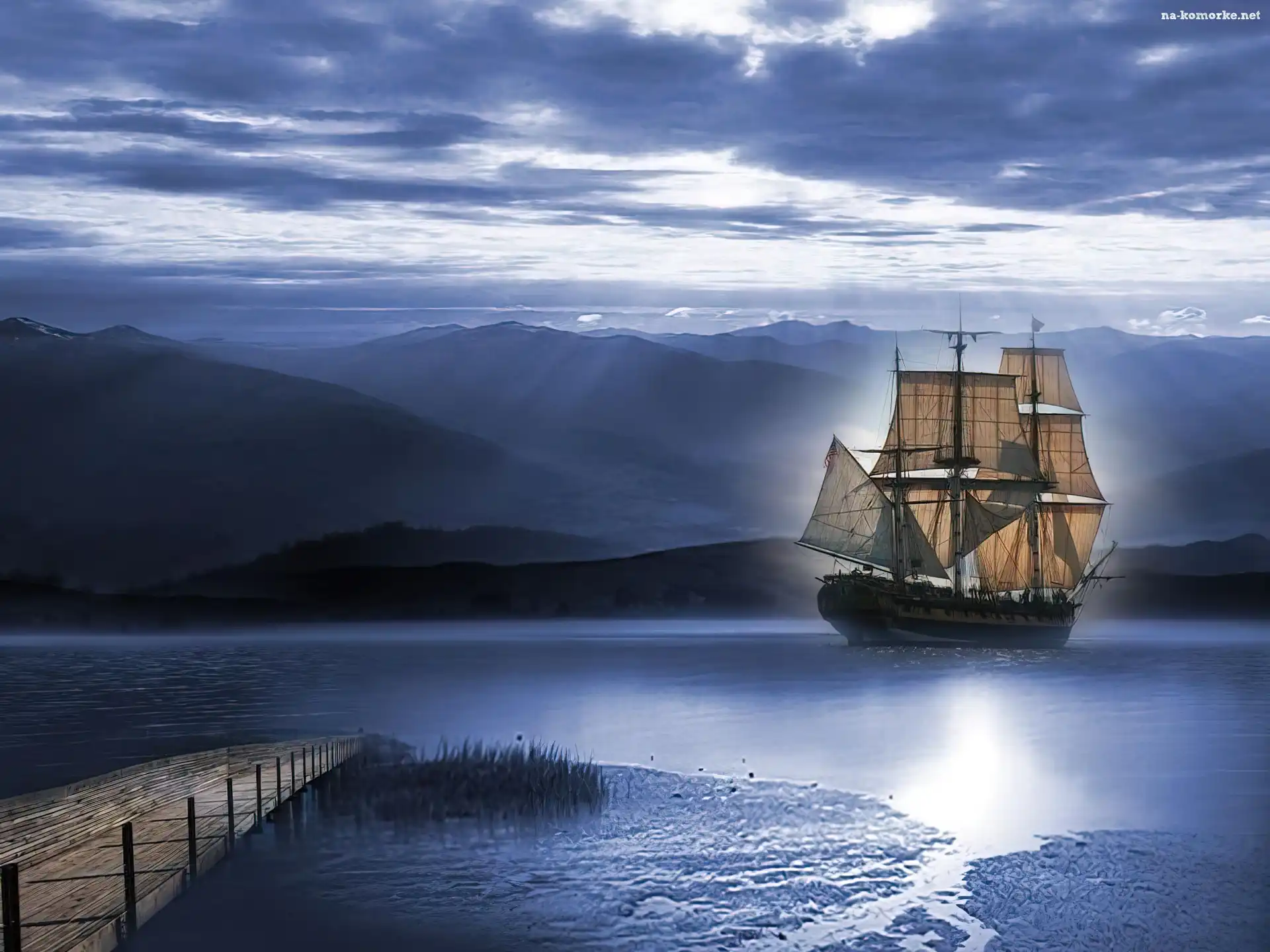 Żaglowiec, Pomost, Woda, Niebo na Komórkę