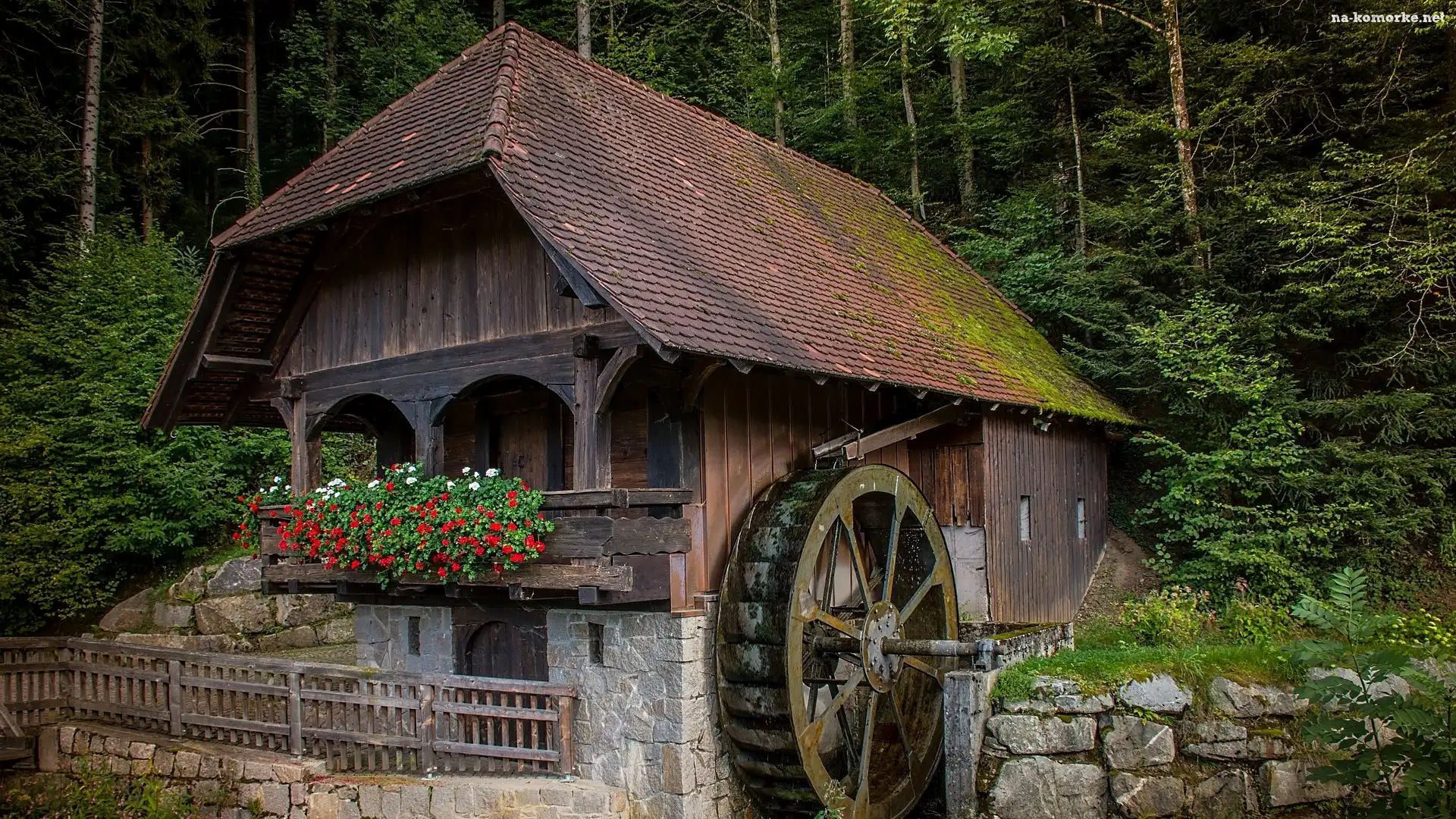 Młyn wodny, Las, Drzewa, Okna, Balkon, Kwiaty, Płot na Komórkę