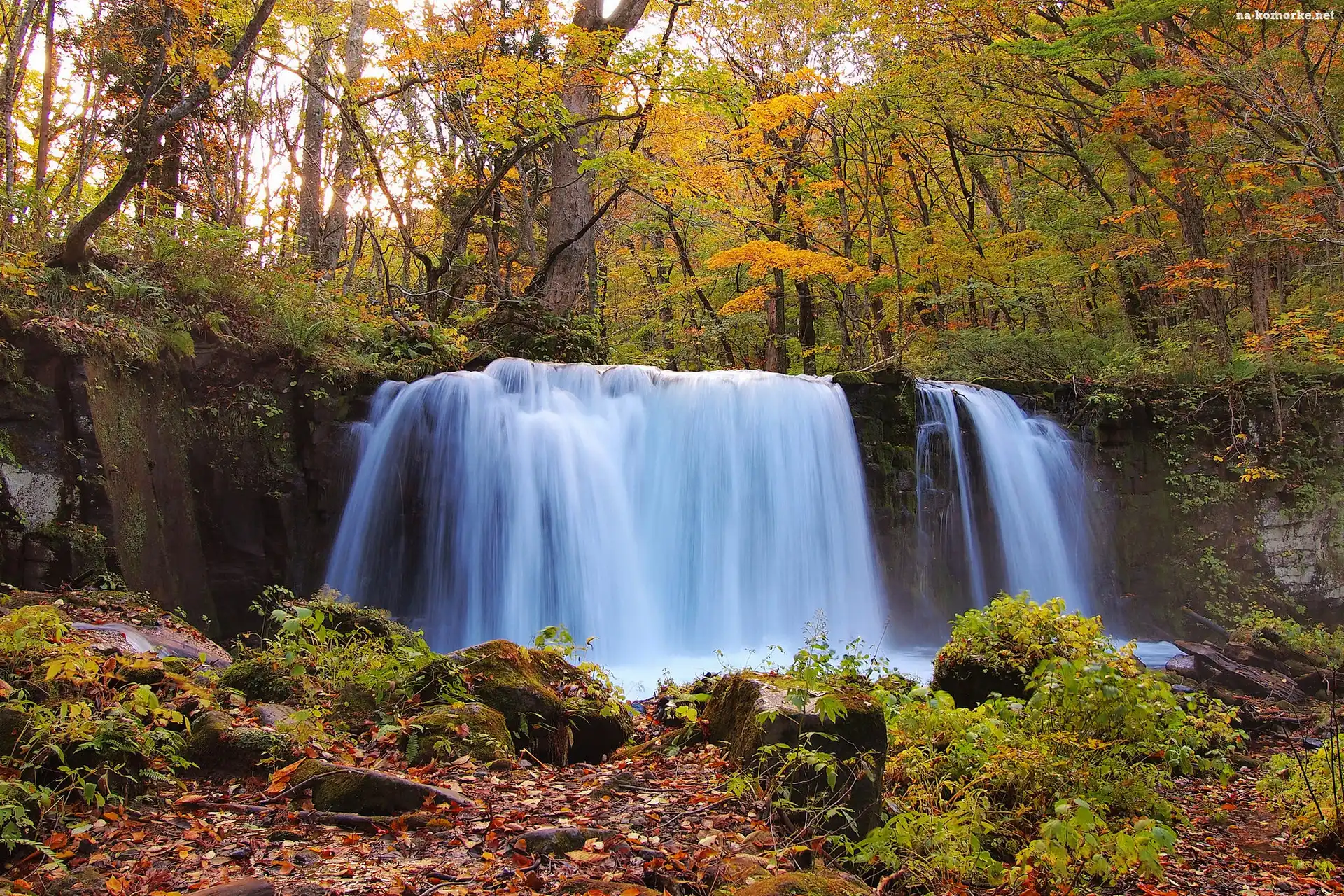 Wodospad, Las, Jesień, Kamienie, Drzewa, Omszałe na Komórkę