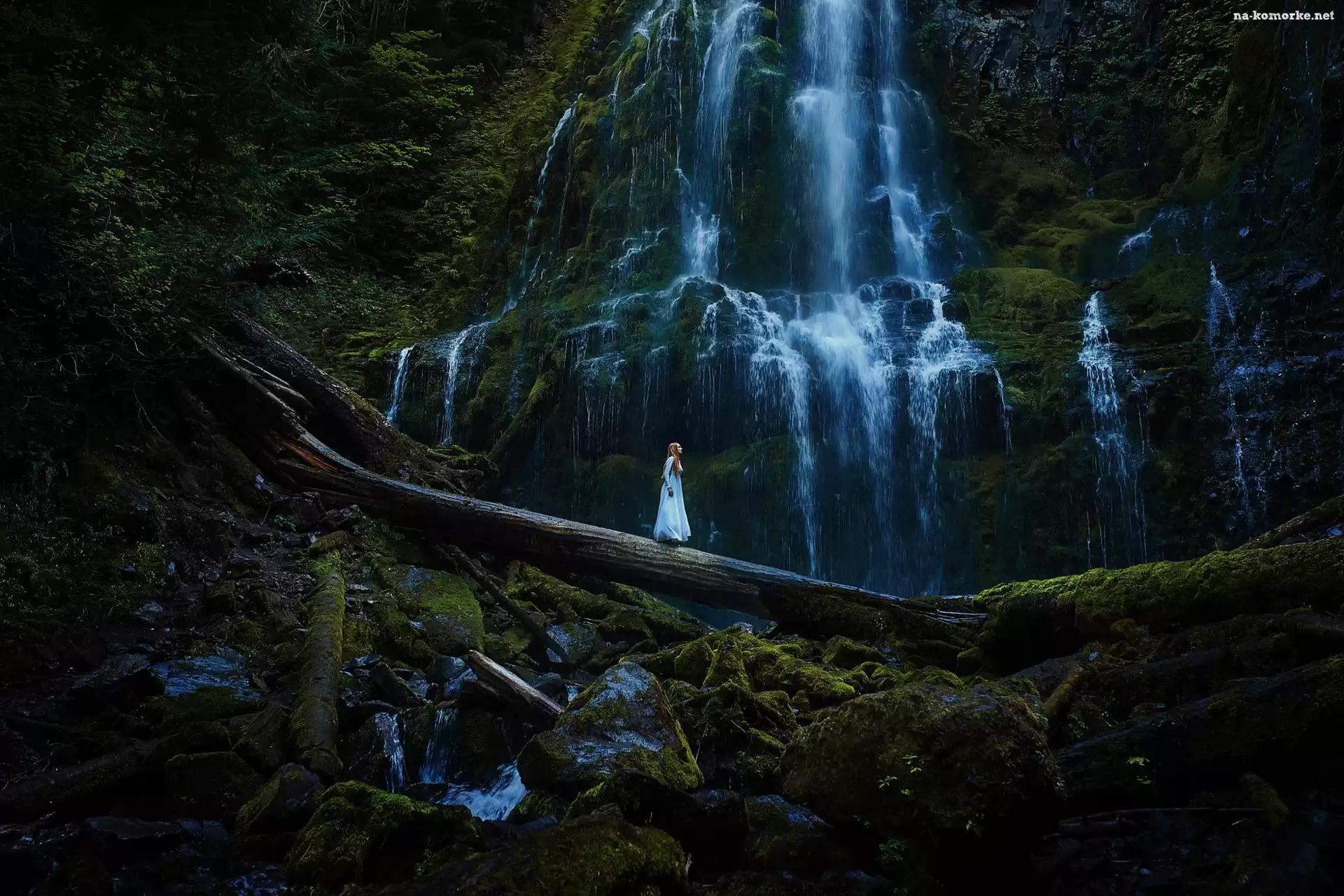 Wodospad, Kobieta, Drzewa, Mech na Komórkę