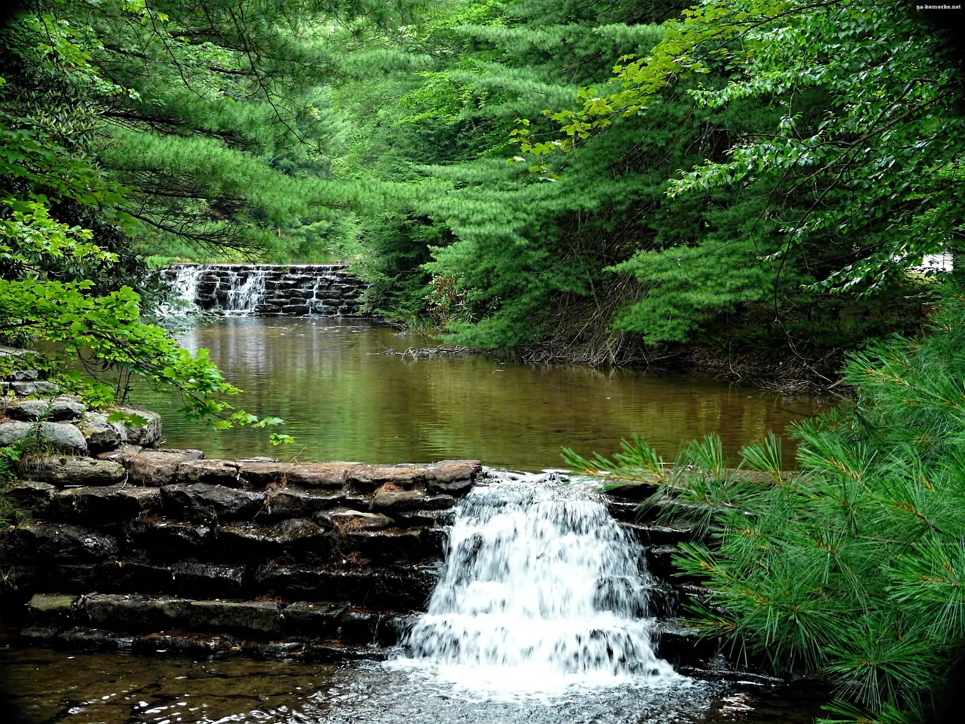 Wodospad, Drzewa, Jeziorko, Ogród na Komórkę