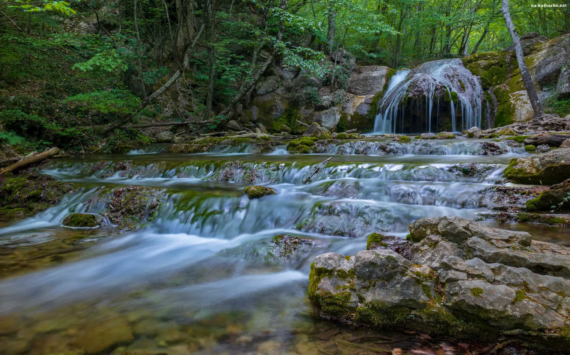 Wodospad, Drzewa, Las, Kamienie, Kaskada, Skały na Komórkę