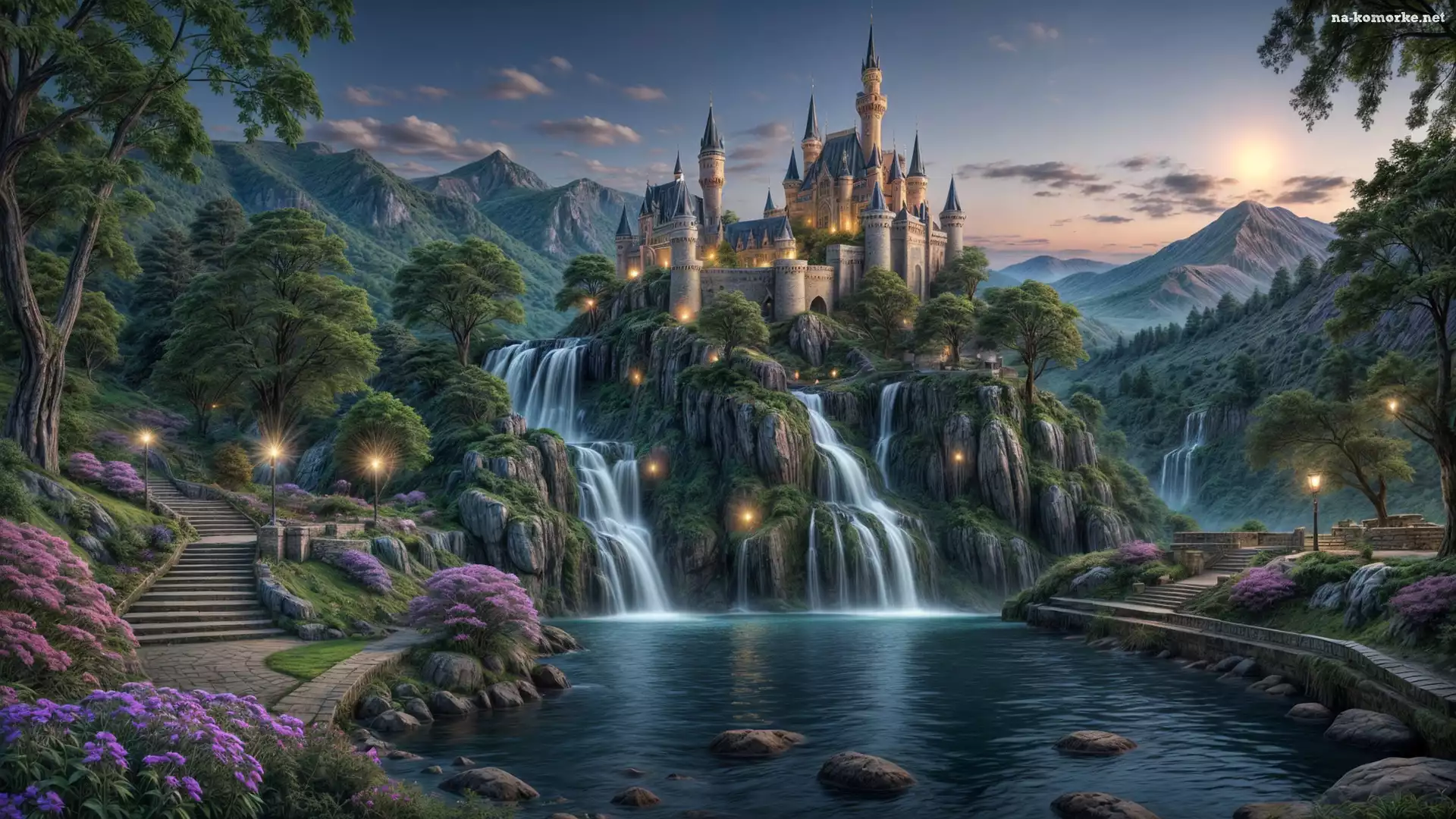 Skała, Góra, Kwiat, Zamek, Drzewo, Grafika, Schod, Wodospad na Komórkę