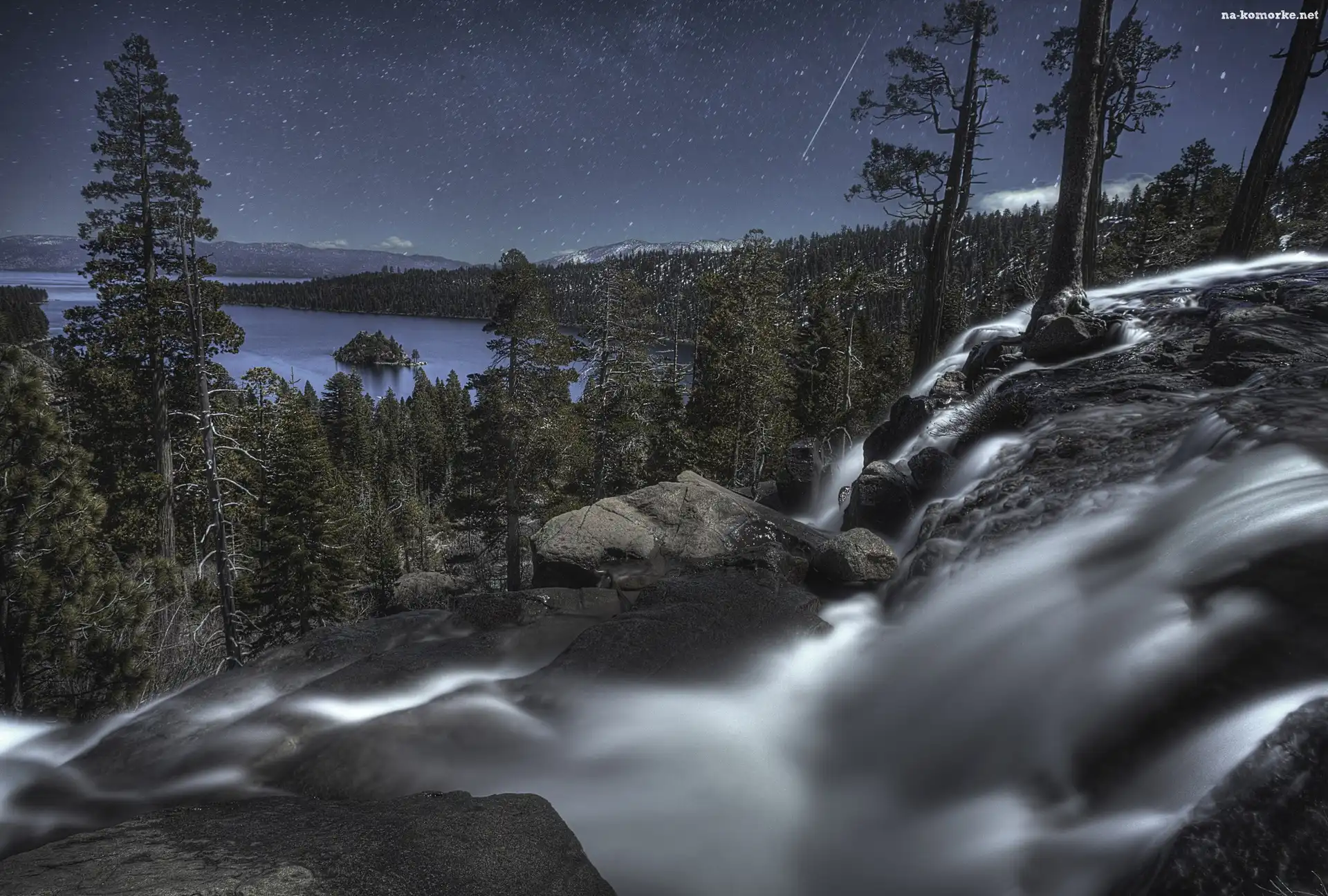 Wodospad, Noc, Las, Jezioro na Komórkę