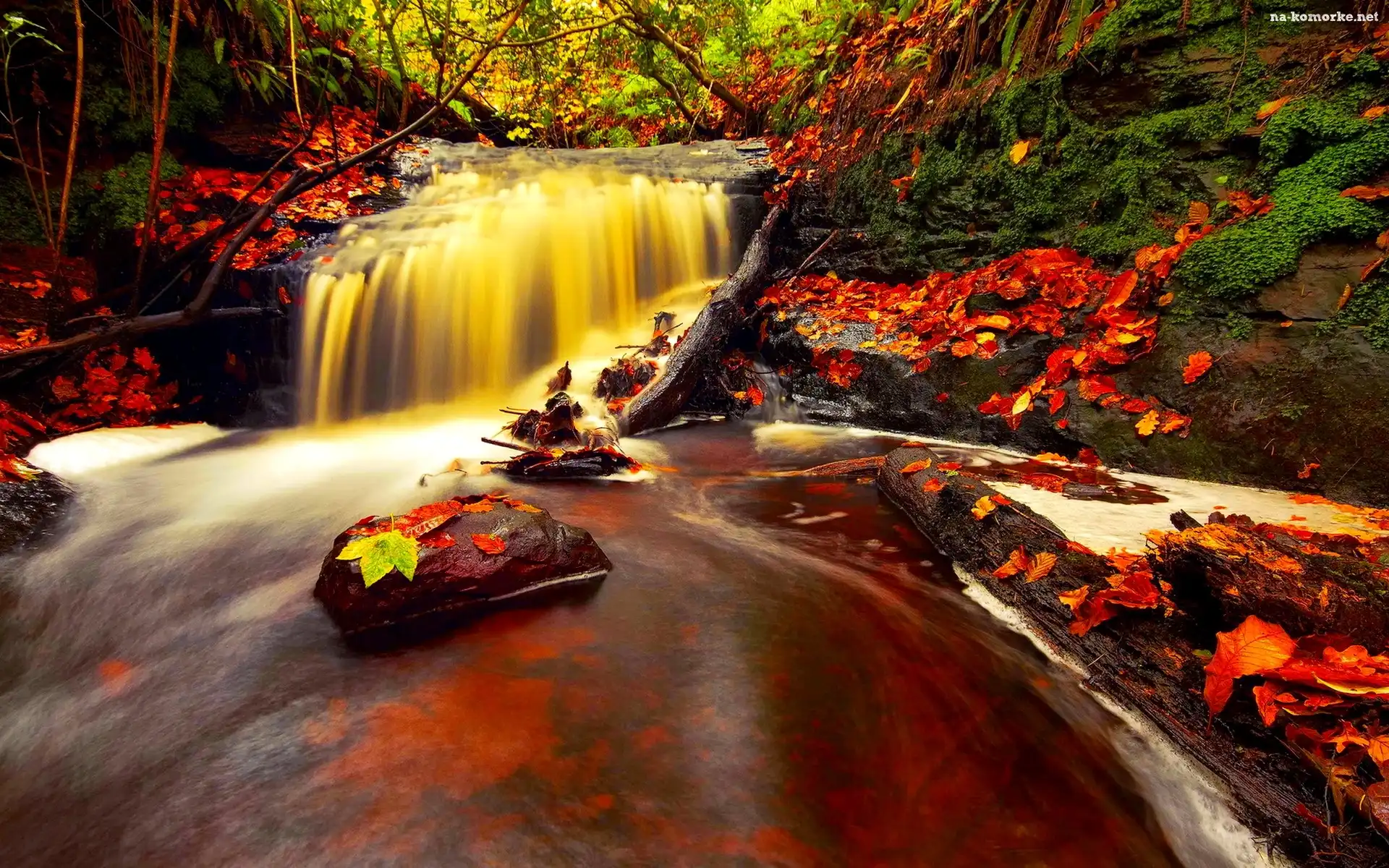 Wodospad, Drzewa, Rzeczka, Liście na Komórkę