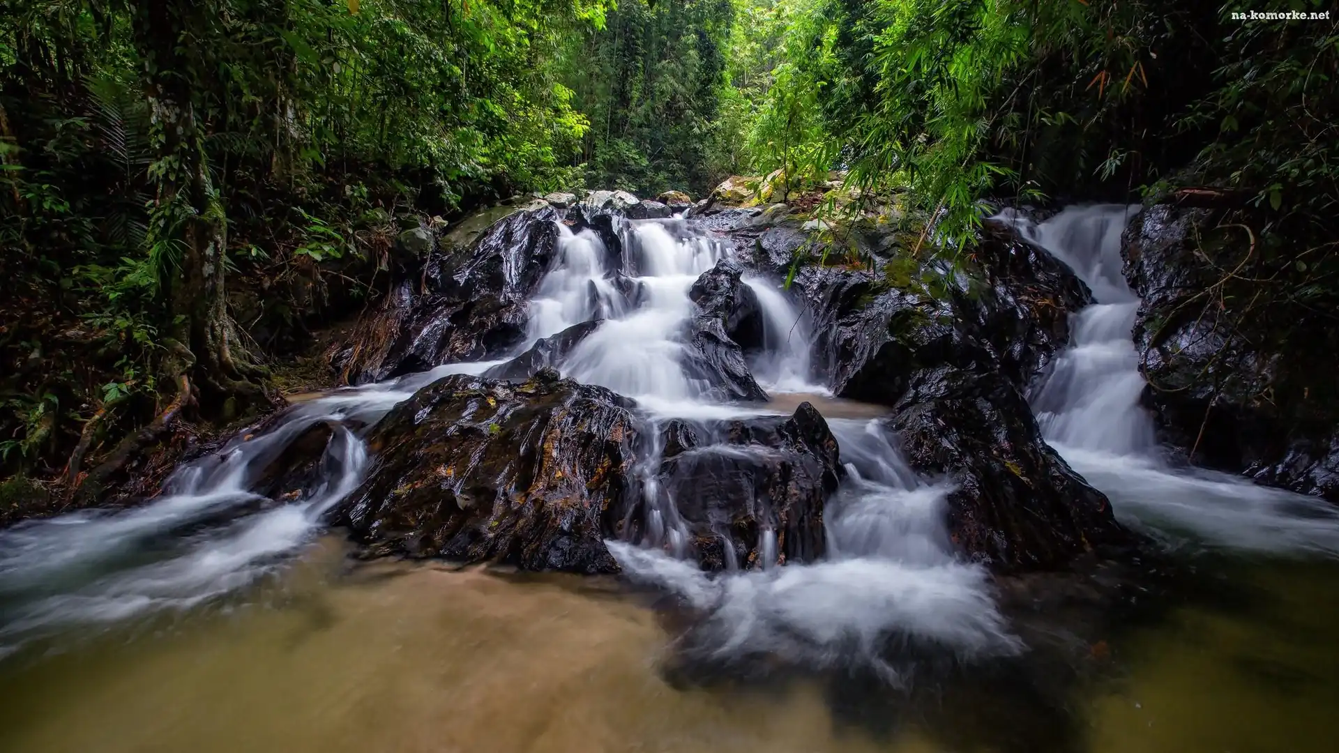 Wodospad, Drzewa, Skały, Las na Komórkę