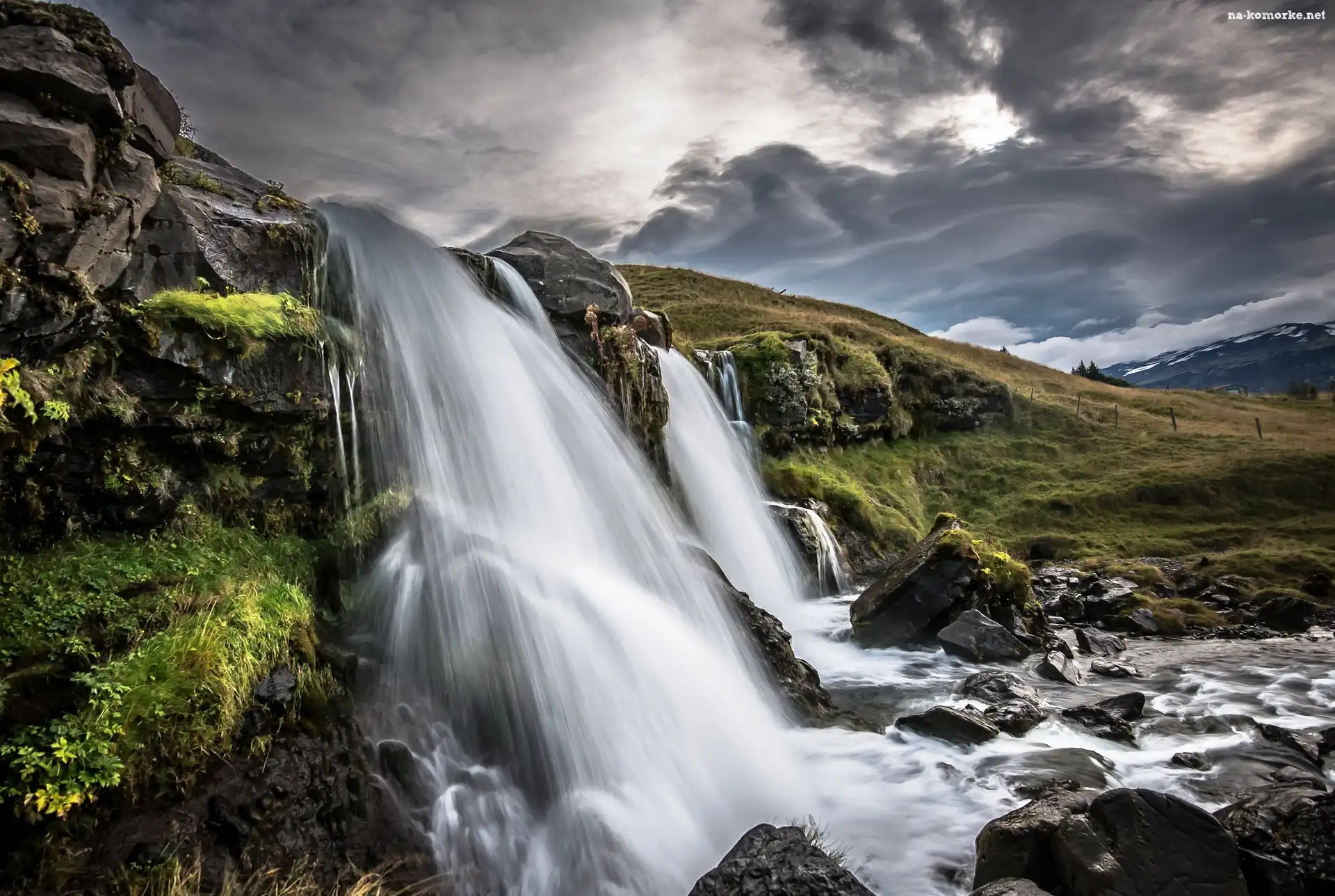 Wodospad, Islandia, Skały, Chmury na Komórkę