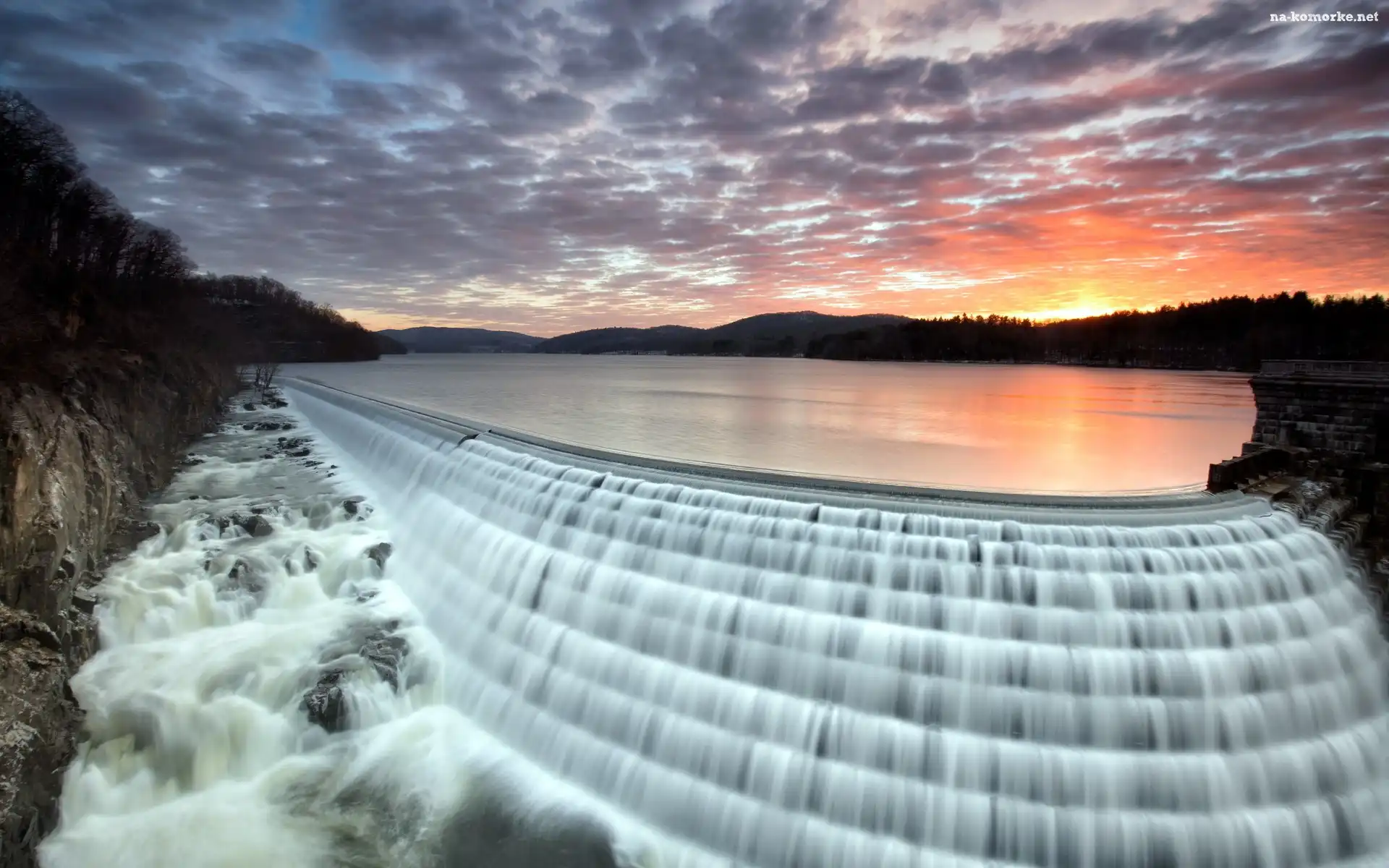 Wodospad, Zachód, Słońca, Skały, Las na Komórkę