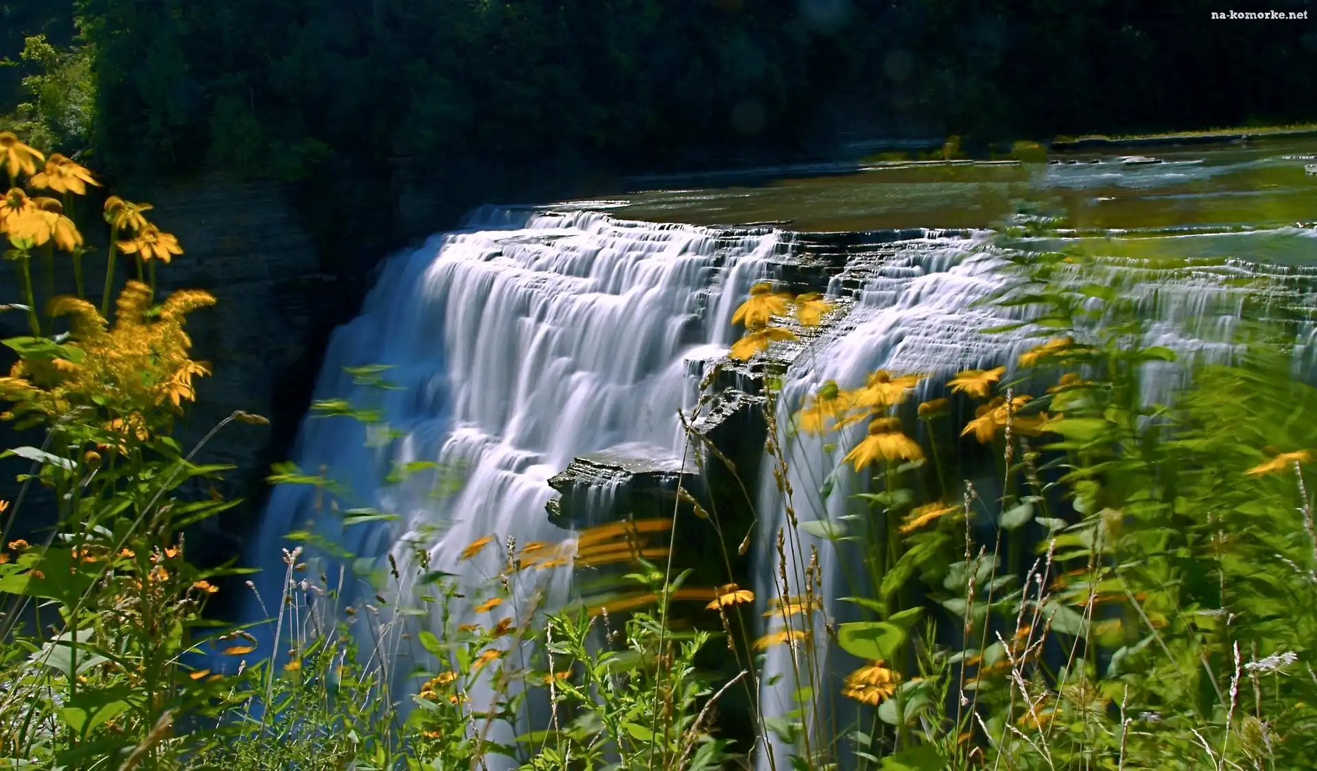 Wodospad, Trawy, Skały, Kwiaty na Komórkę