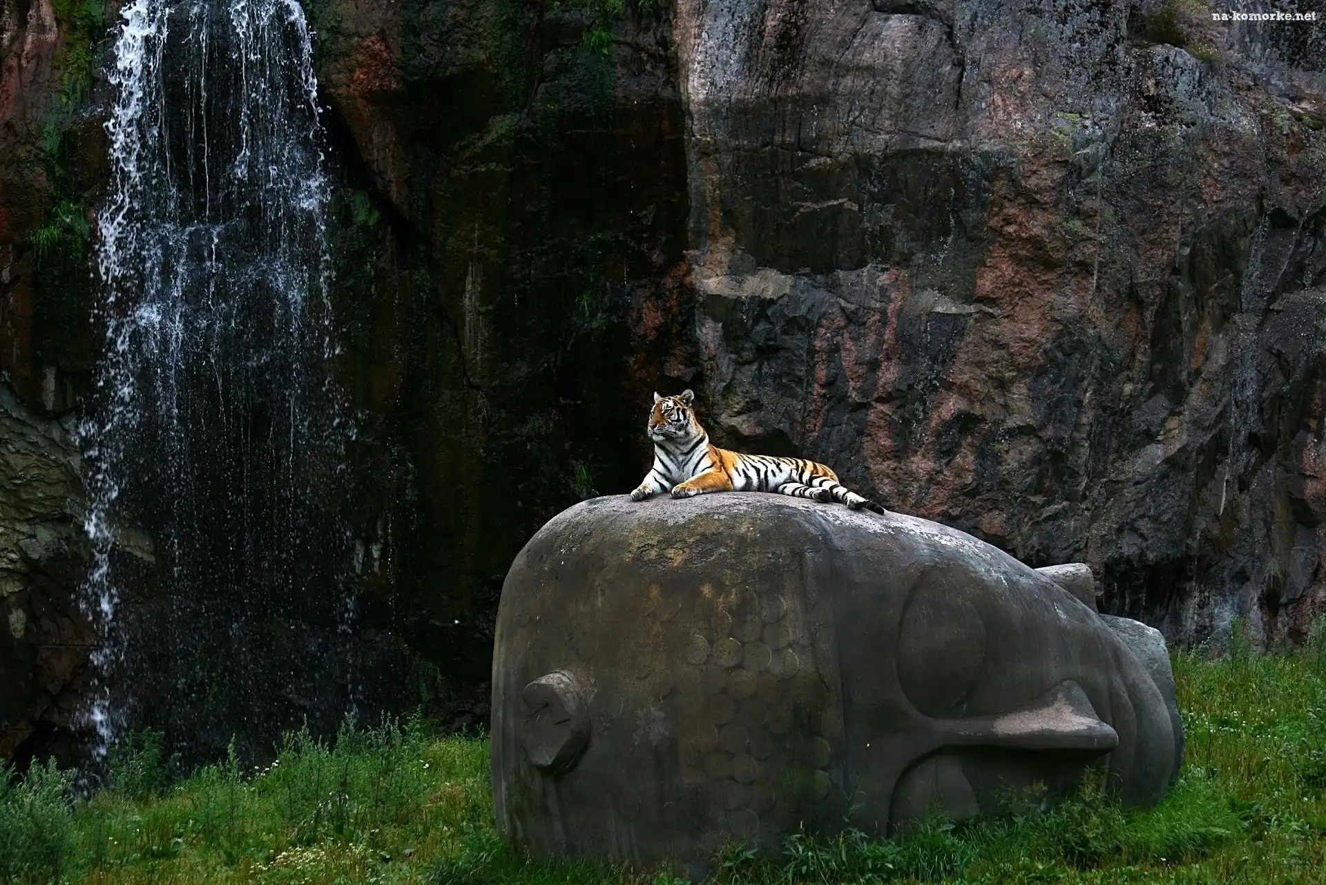 Wodospad, Tygrys, Skały, Posąg na Komórkę