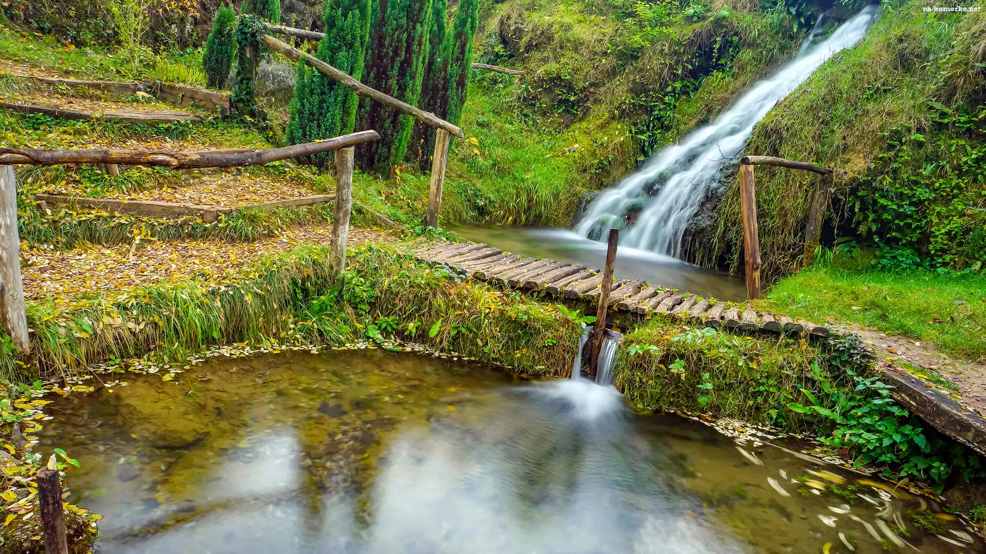 Wodospad, Park, Staw, Mostek na Komórkę