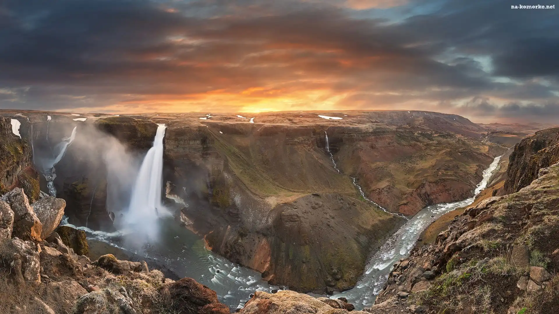 Wodospad, Chmury, Rzeka, Zachód słońca na Komórkę