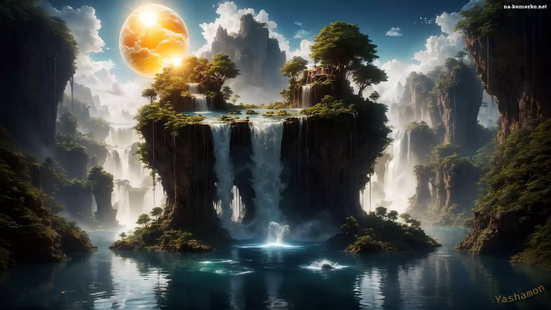 Grafika, Wodospady, Drzewa, Skały, Słońce na Komórkę