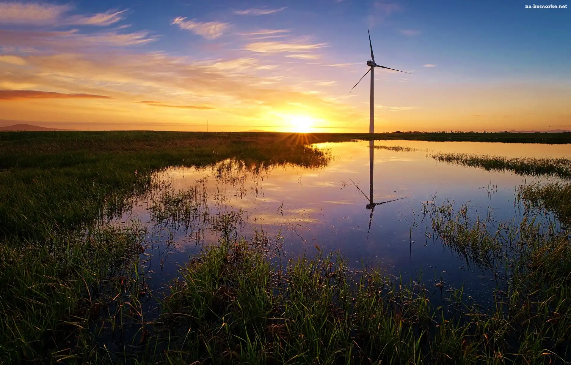 Wody, Słońca, Zachód, Trawa, Rozlewiska, Wiatrak na Komórkę