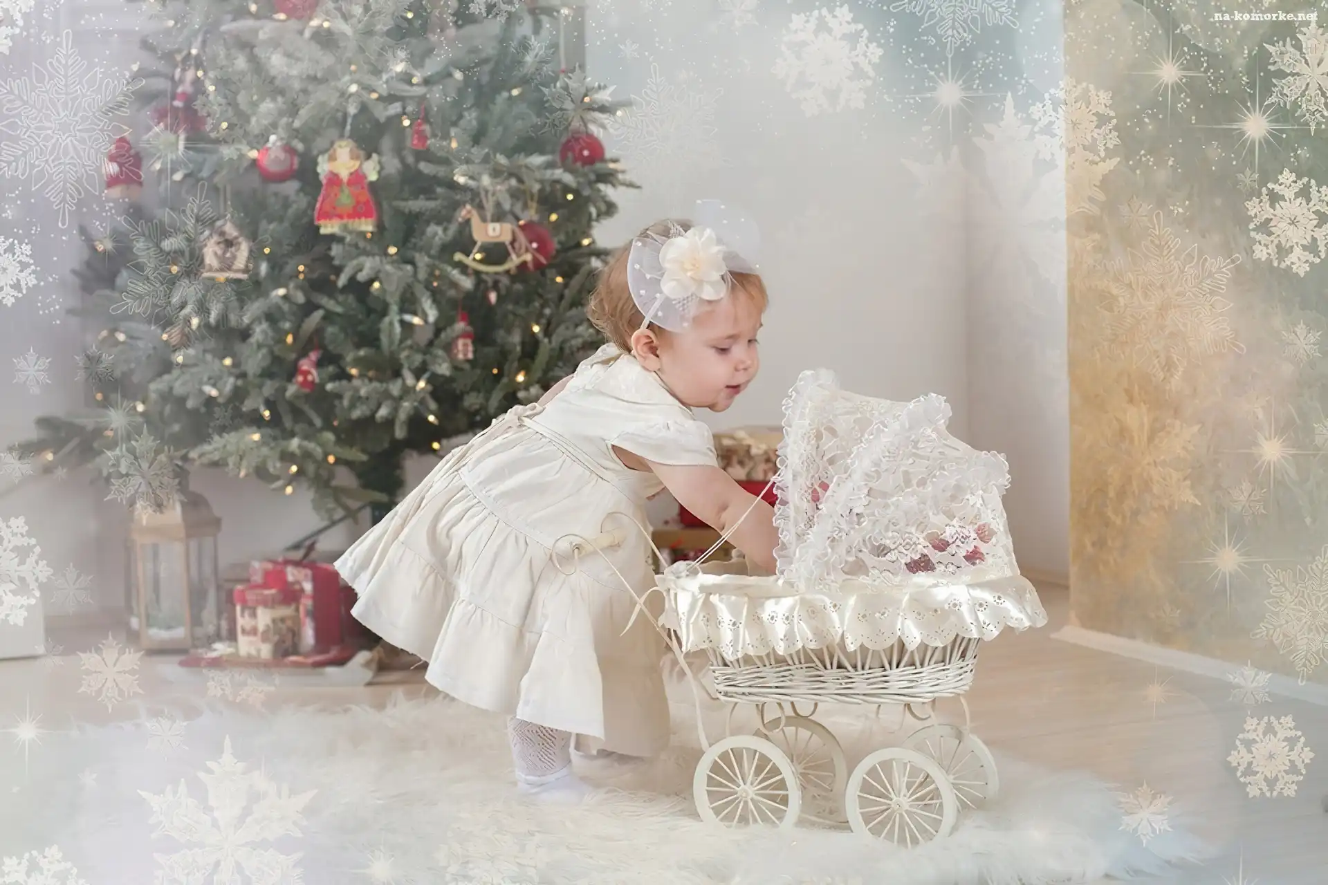 Święta, Mała, Dziewczynka, Wózek, Choinka na Komórkę