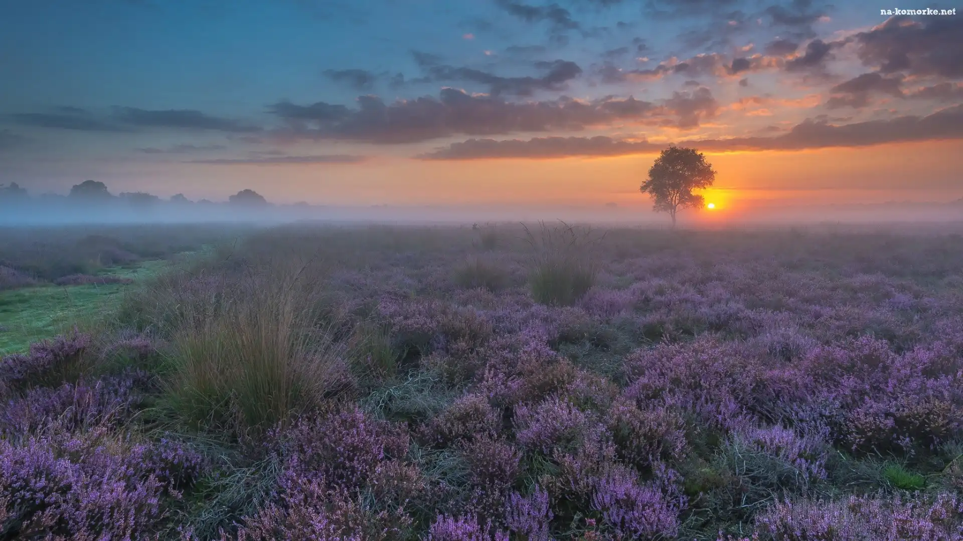 Wrzosowisko, Wschód, Słońca, Mgła, Drzewo na Komórkę