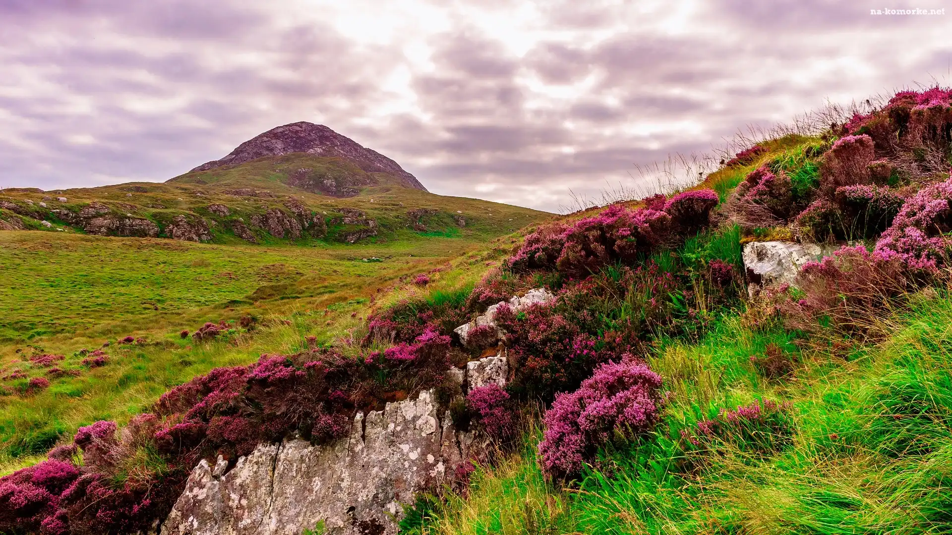 Wzgórza, Park Narodowy Connemara, Skały, Irlandia, Góra, Kwiaty, Wrzosy, Wrzosowisko na Komórkę