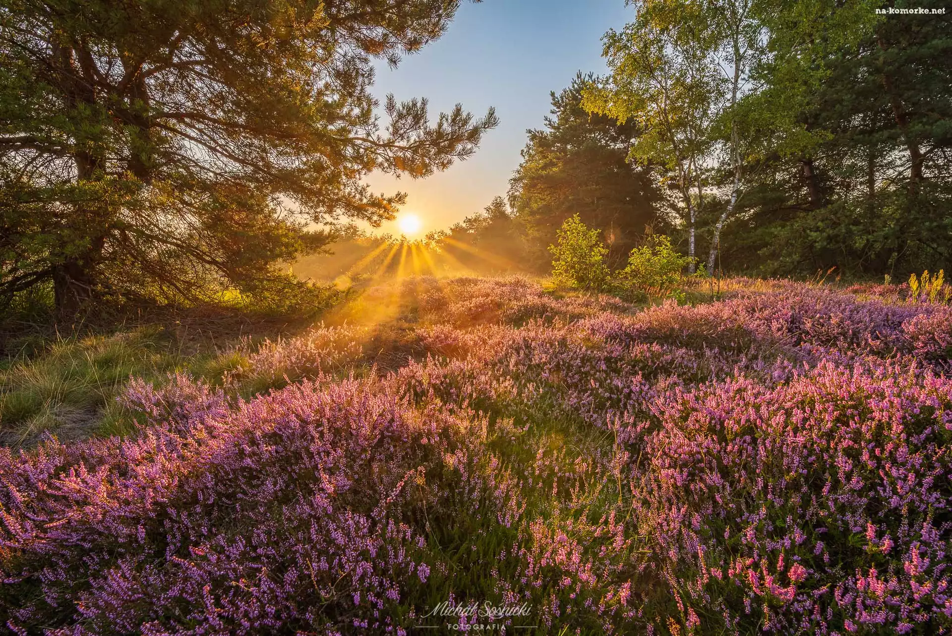Promienie słońca, Polana, Wrzosy, Drzewa, Wrzosowisko na Komórkę