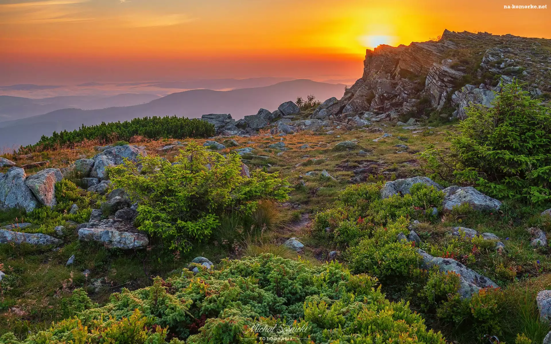 Wschód słońca, Skały, Polska, Roślinność, Beskidy, Babia Góra, Góry na Komórkę