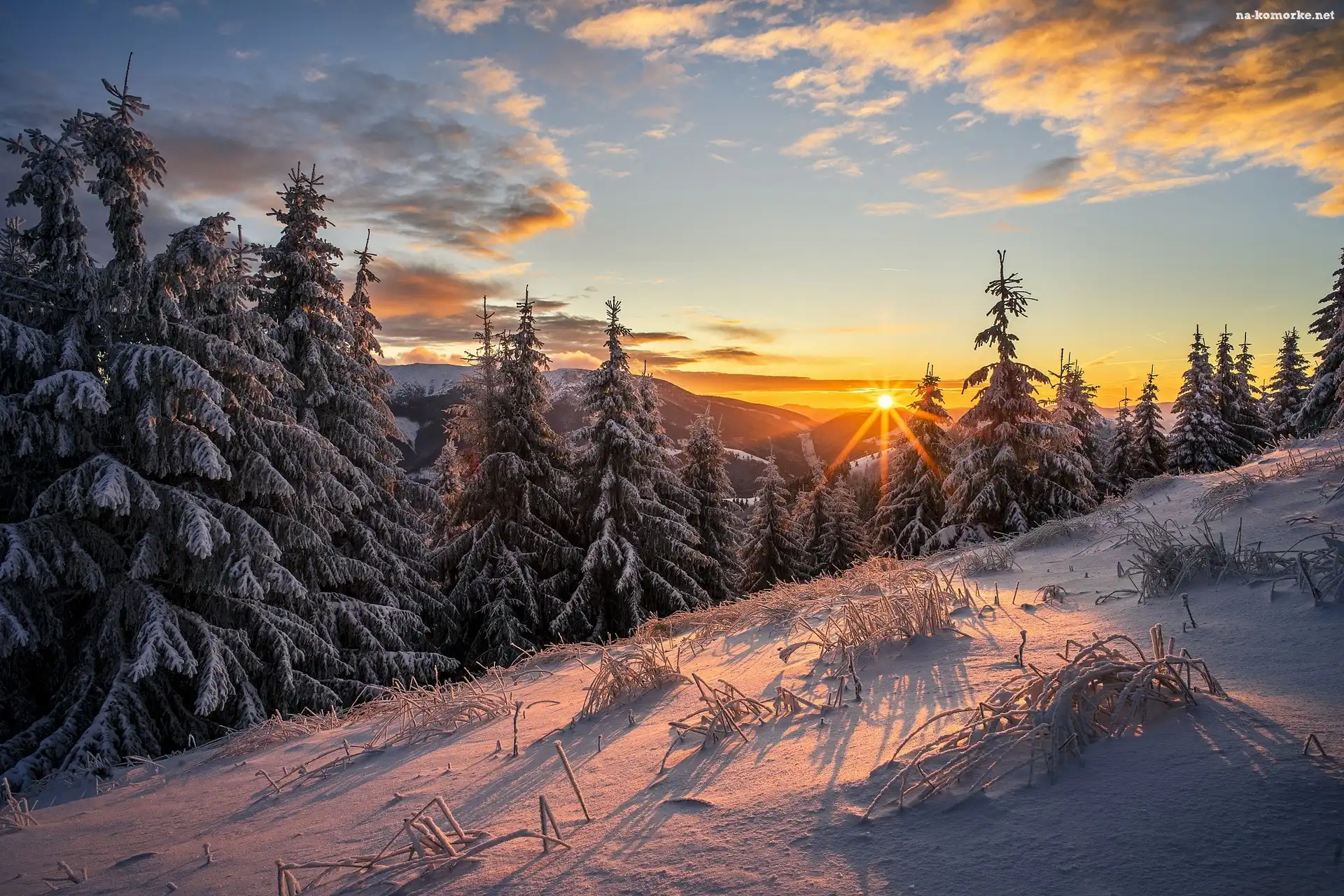 Drzewa, Wschód słońca, Zima, Śnieg, Góry, Las na Komórkę