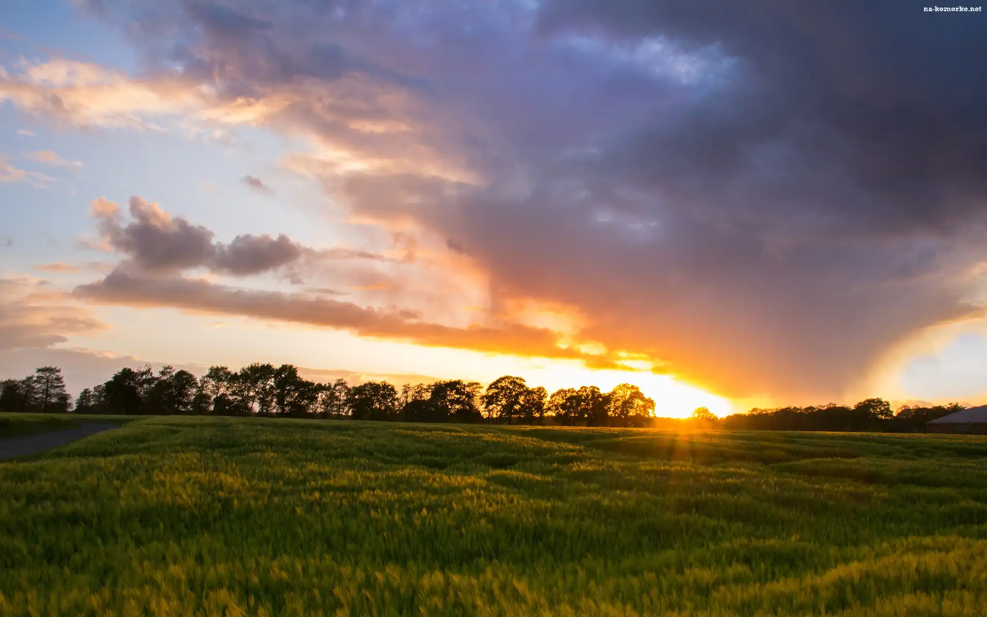 Drzewa, Wschód słońca, Łąka, Chmury, Droga, Niebo na Komórkę