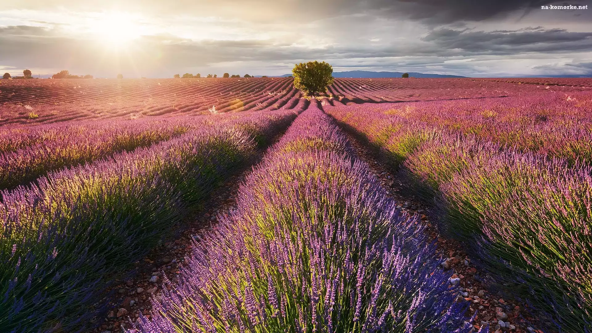 Wschód słońca, Pole, Lawenda, Drzewa, Chmury na Komórkę