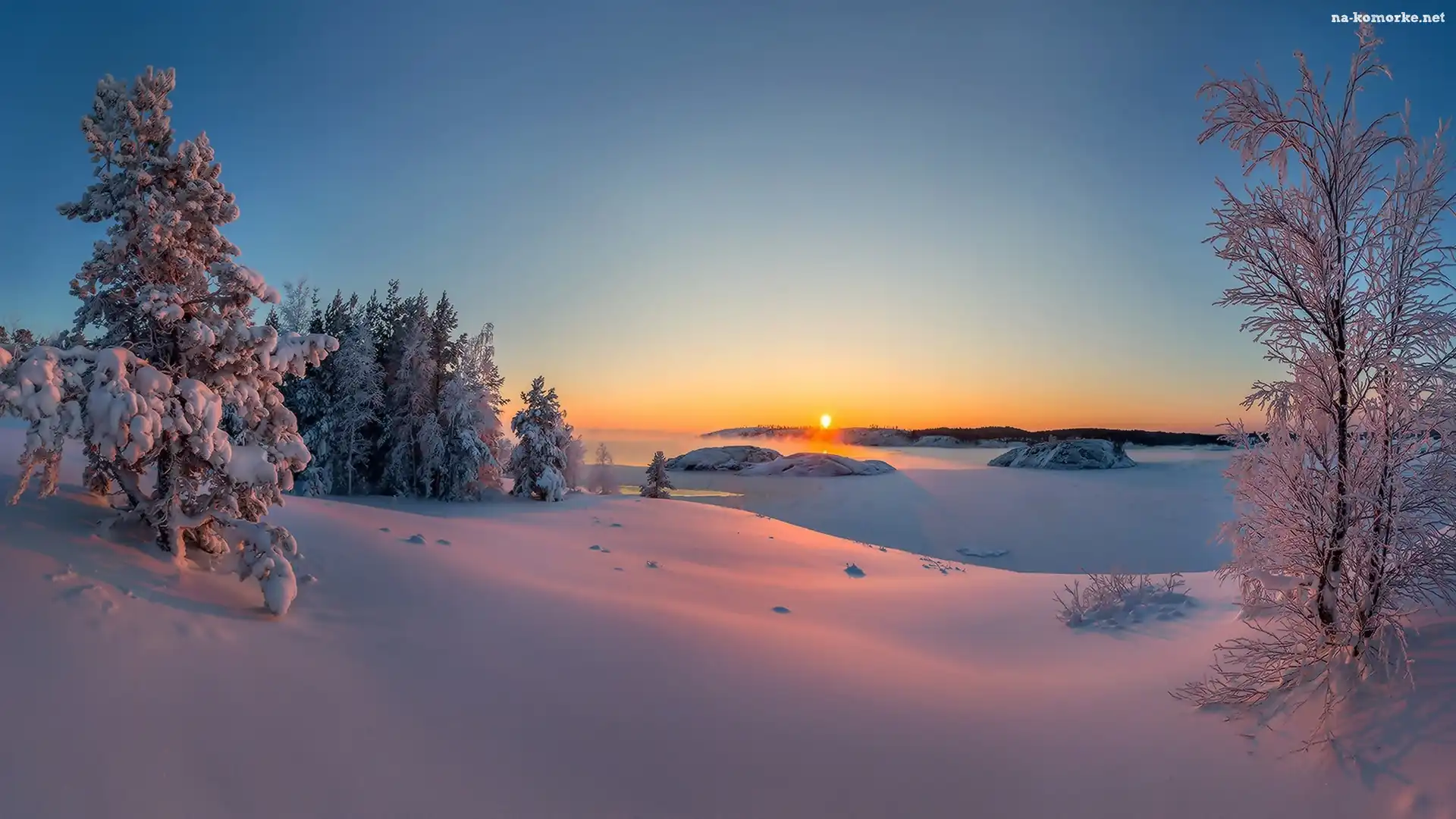 Śnieg, Drzewa, Zima, Wschód słońca na Komórkę
