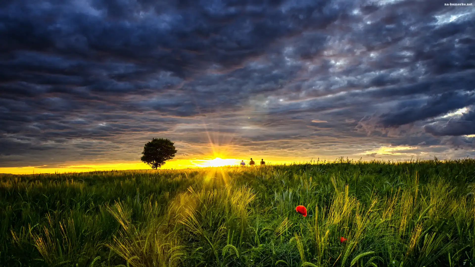 Łąka, Drzewo, Chmury, Wschód słońca na Komórkę