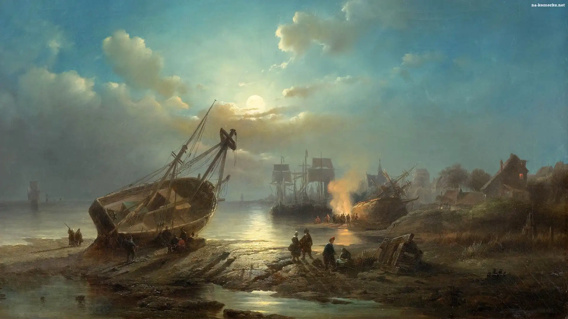 Henri Adolphe Schaep, Malarstwo, Żaglowce, Wschód słońca, Domy, Obraz, Ludzie, Jezioro, Mgła na Komórkę |