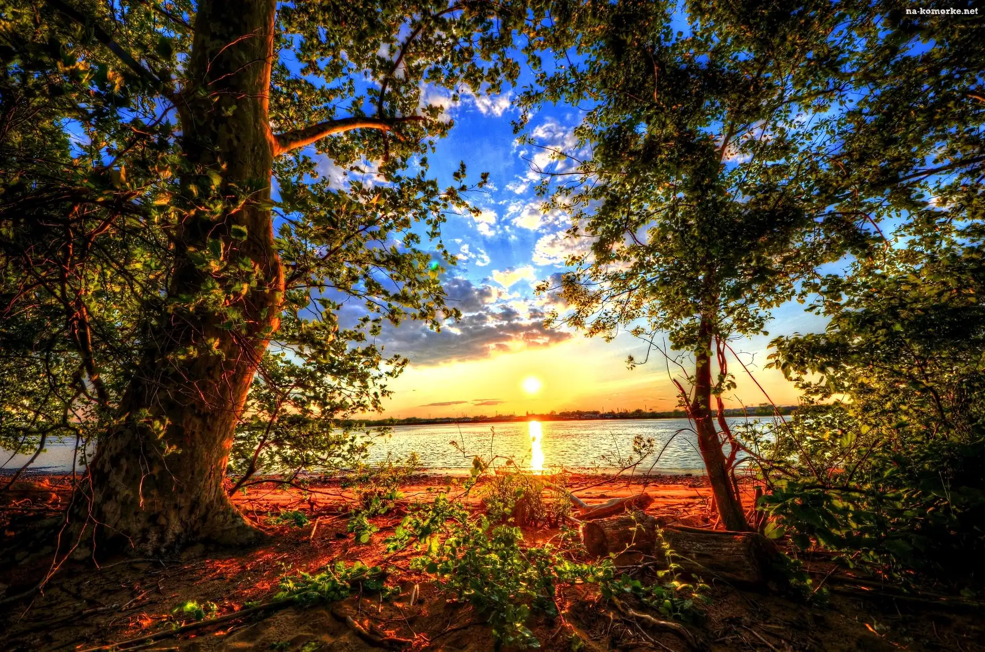 Wschód słońca, Jezioro, Drzewa na Komórkę