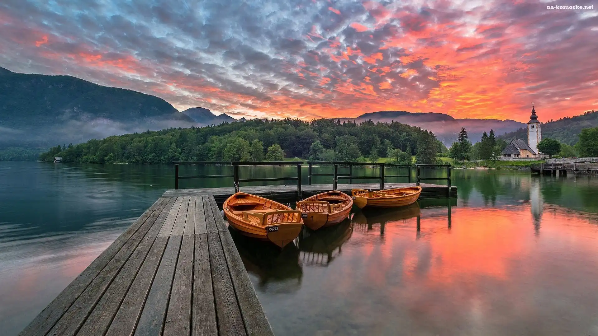Kościół św Jana, Pomost, Wschód słońca, Jezioro Bohinj, Słowenia, Łódki, Gmina Bohinj, Drzewa, Chmury na Komórkę |