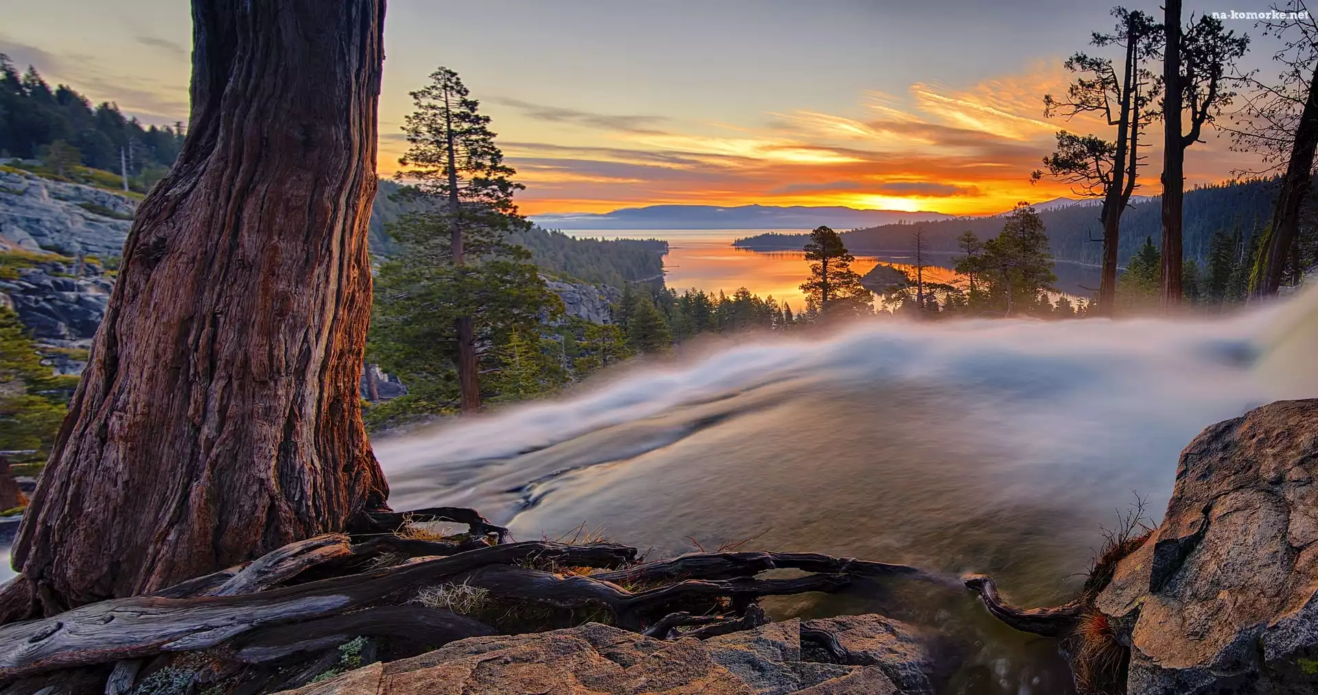Wschód Słońca, Góry, Jezioro, Mgła, Drzewa na Komórkę