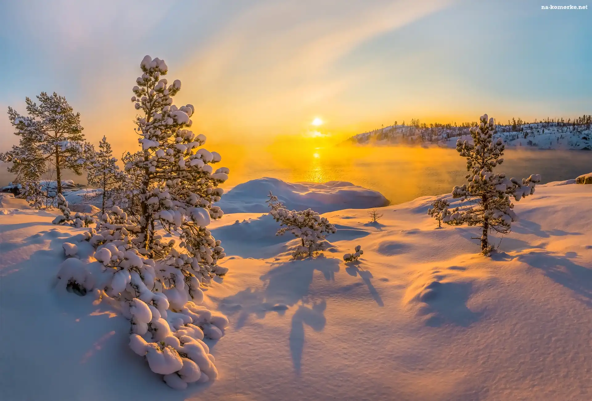 Wschód słońca, Zima, Jezioro, Mgła, Drzewa na Komórkę