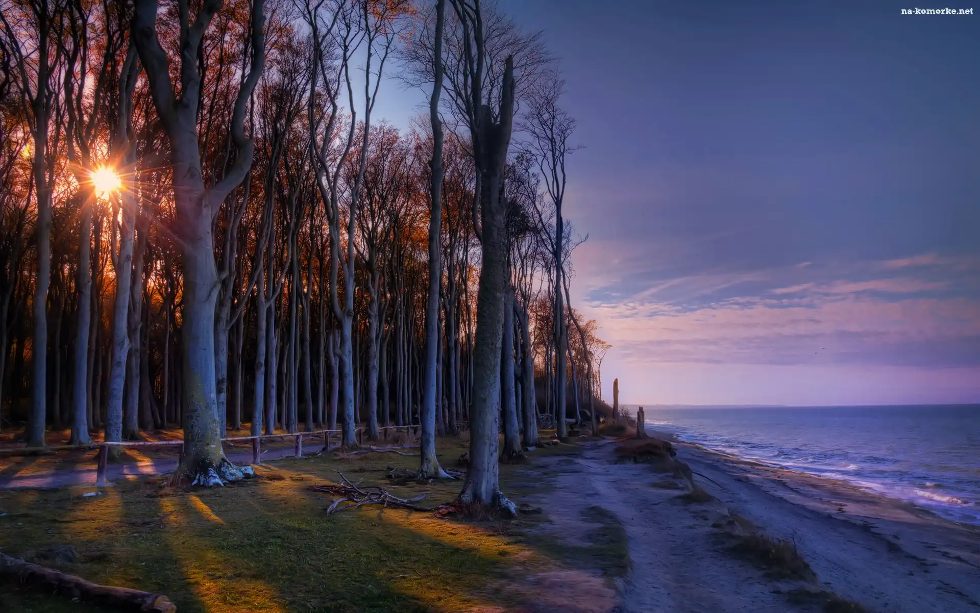 Wschód słońca, Las, Morze, Brzeg na Komórkę