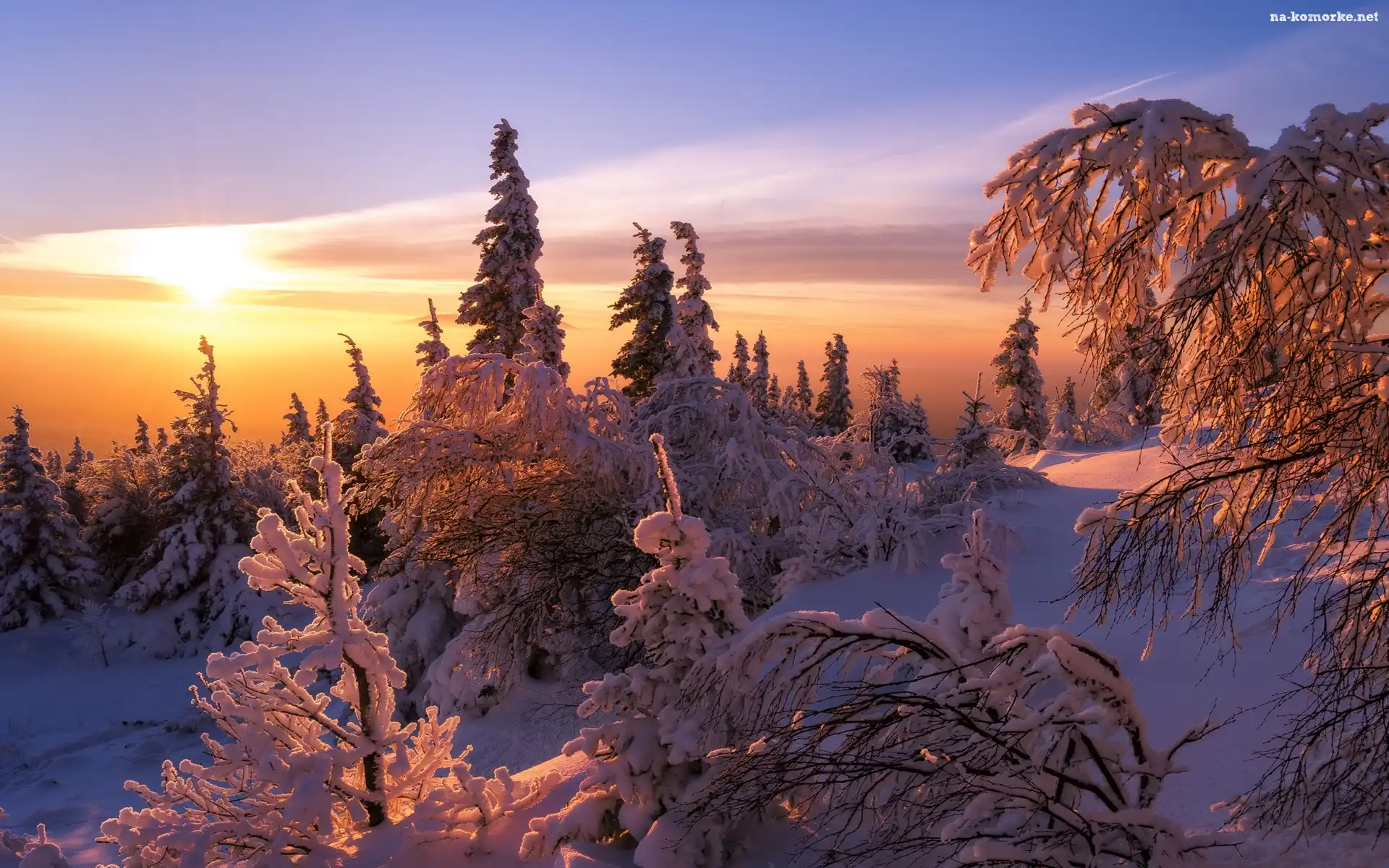 Wschód słońca, Zima, Las, Ośnieżone, Drzewa na Komórkę