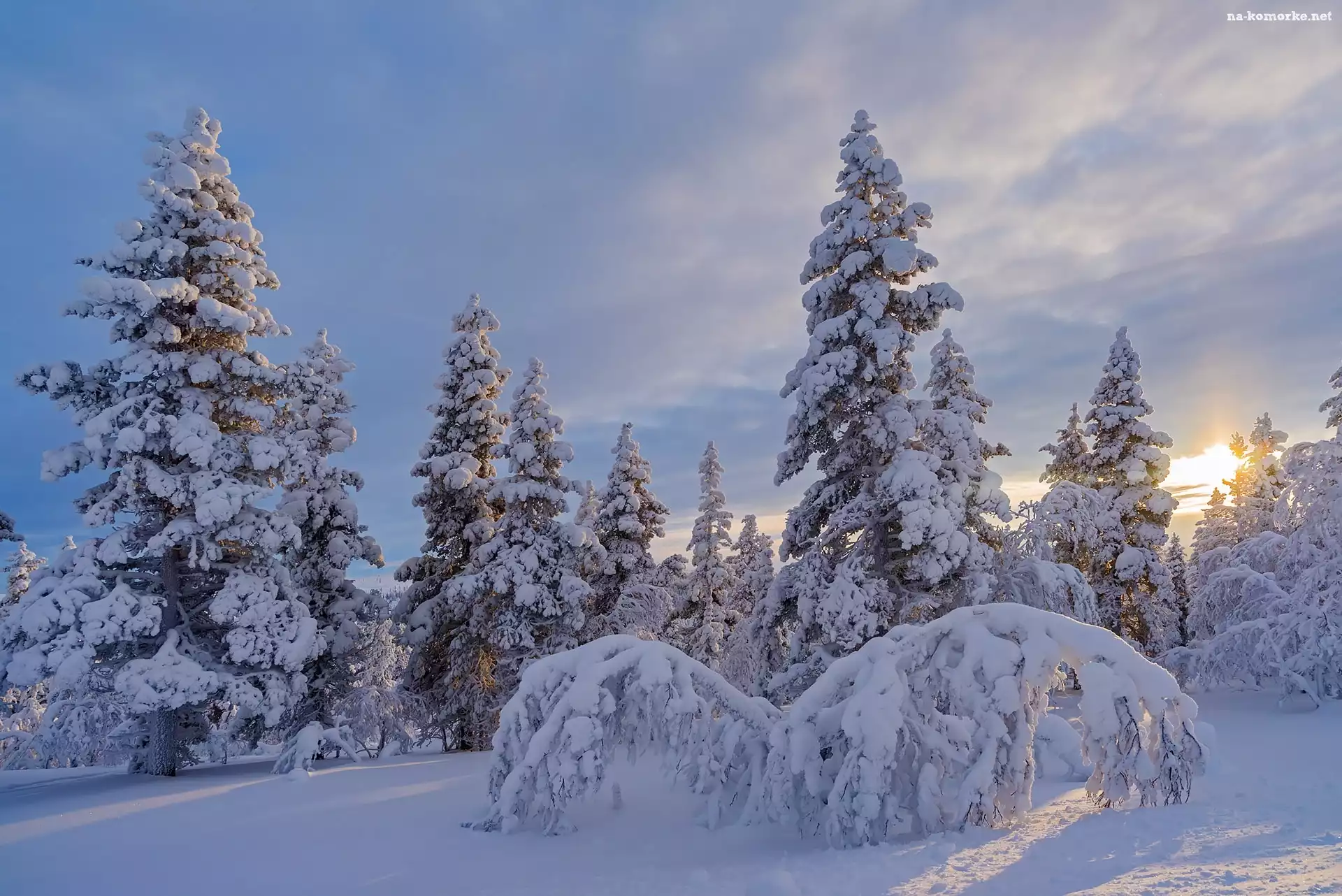 Wschód słońca, Zima, Las, Ośnieżone, Świerki na Komórkę