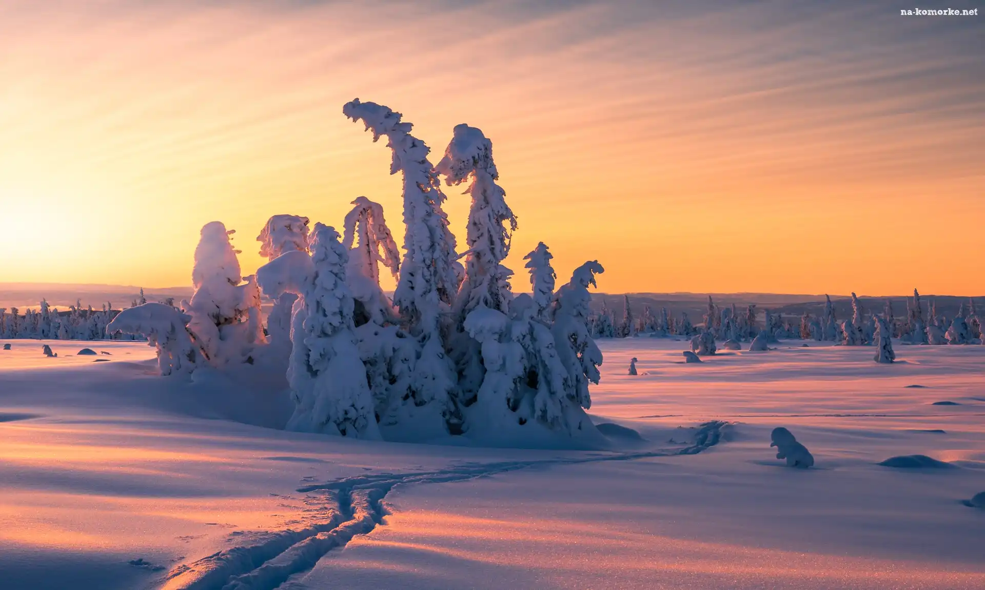Drzewa, Zima, Ośnieżone, Wschód słońca, Śnieg, Ślady na Komórkę