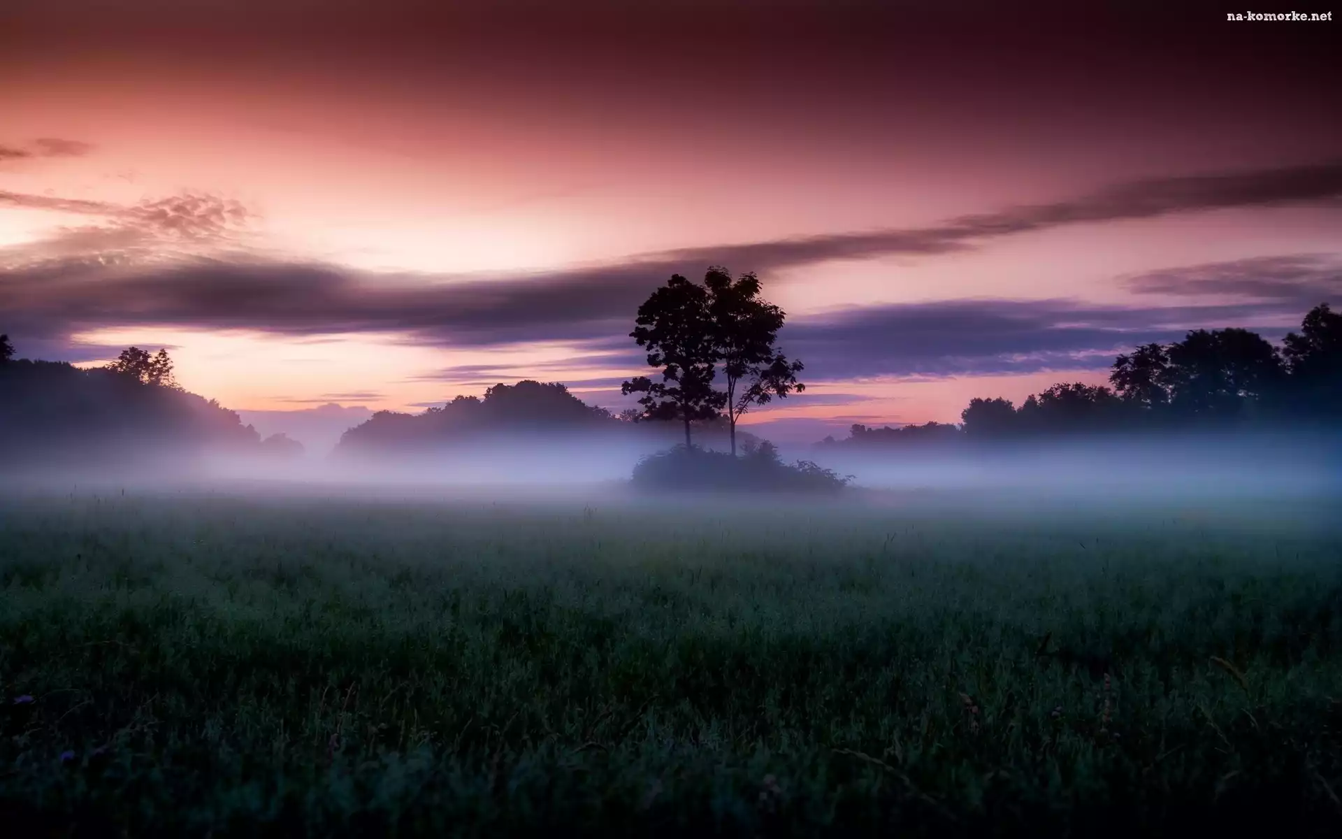 Wschód Słońca, Drzewa, Pola, Mgła na Komórkę