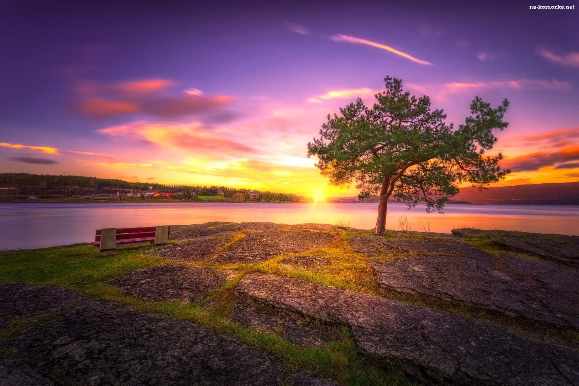 Wschód słońca, Ławka, Rzeka, Drzewo na Komórkę