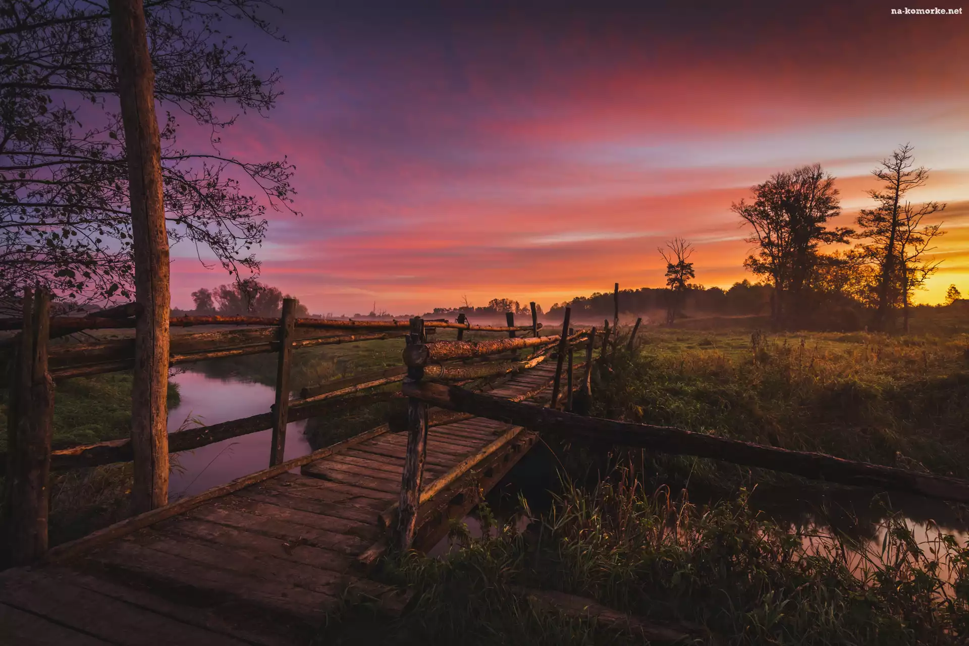 Wschód słońca, Drzewa, Rzeka, Most na Komórkę