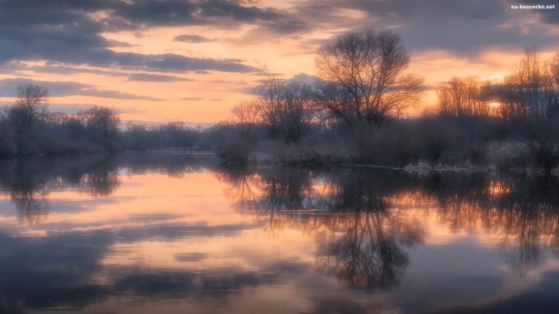 Wschód słońca, Odbicie, Rzeka, Drzewa na Komórkę