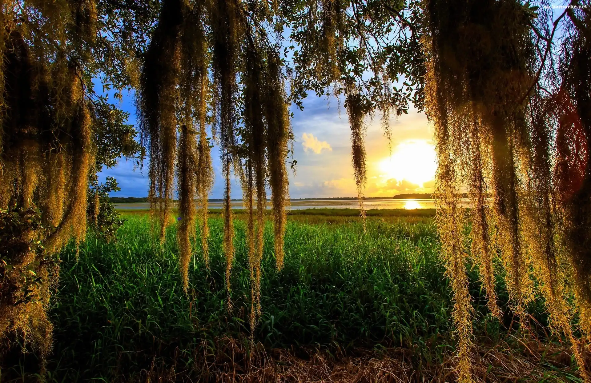 Wschód Słońca, Zarośla, Rzeka, Drzewo na Komórkę