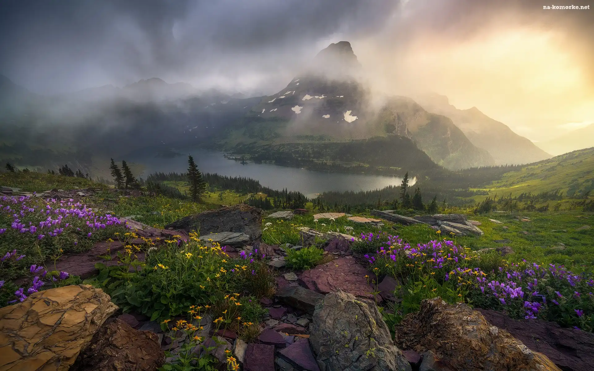 Wschód słońca, Stany Zjednoczone, Stan Montana, Hidden Lake, Chmury, Jezioro, Drzewa, Mgła, Park Narodowy Glacier, Góry, Las, Kwiaty na Komórkę |