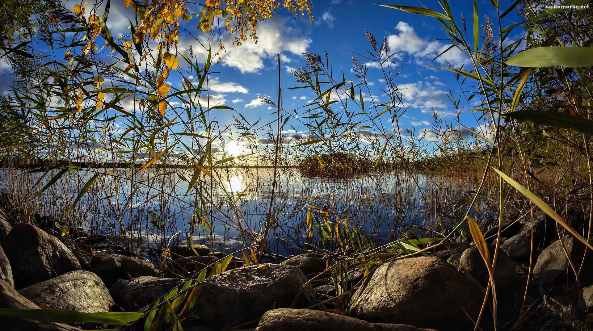 Wschód Słońca, Jezioro, Kamienie, Trzciny, Jesień na Komórkę