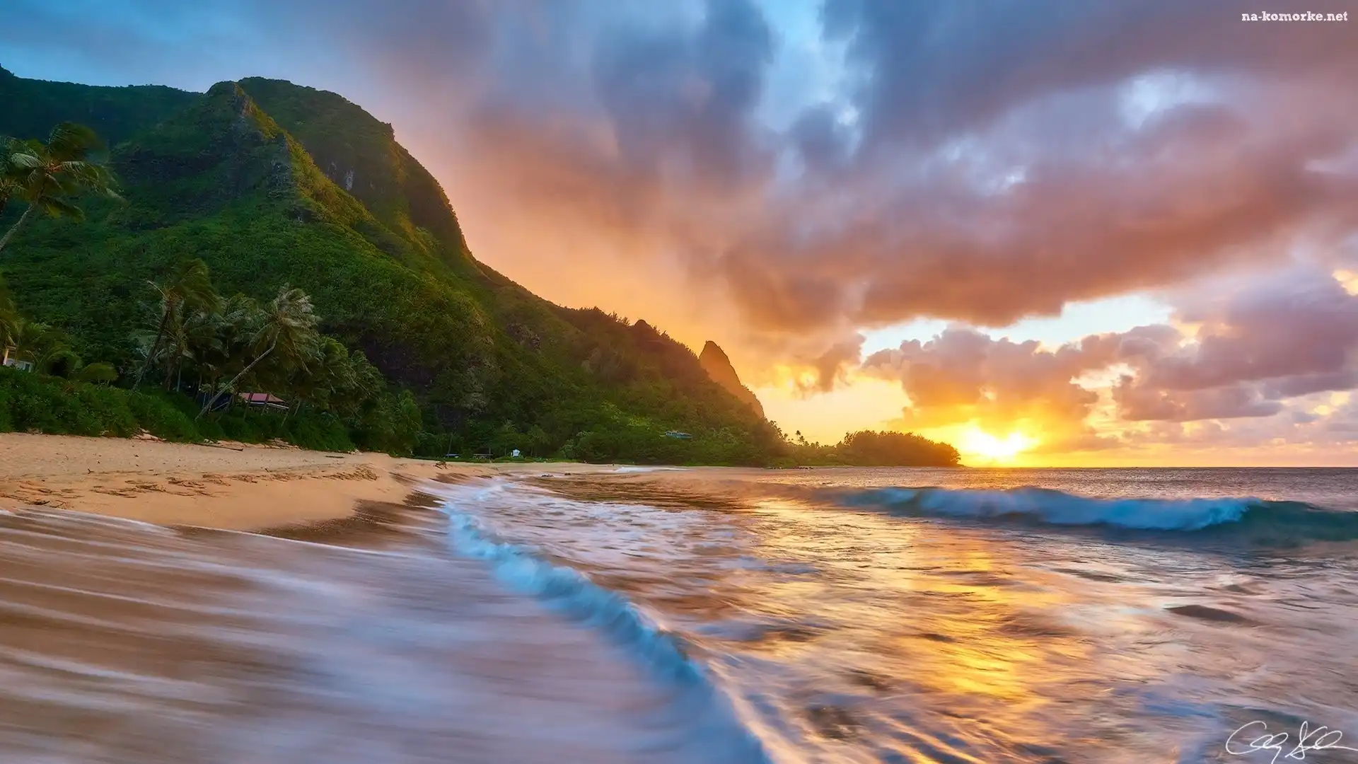 Hawaje, Wschód słońca, Chmury, Morze, Plaża, Palmy, Wzgórza na Komórkę